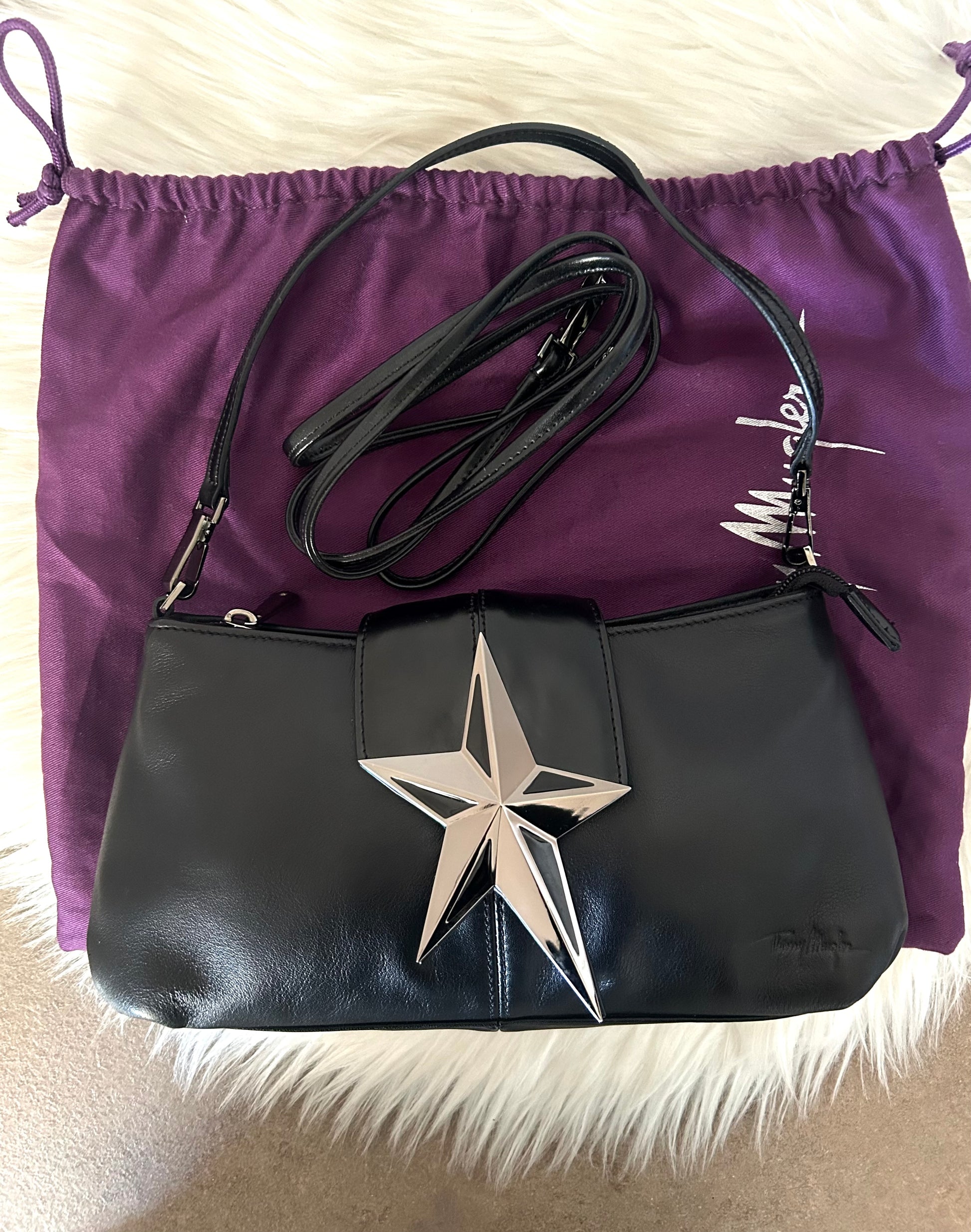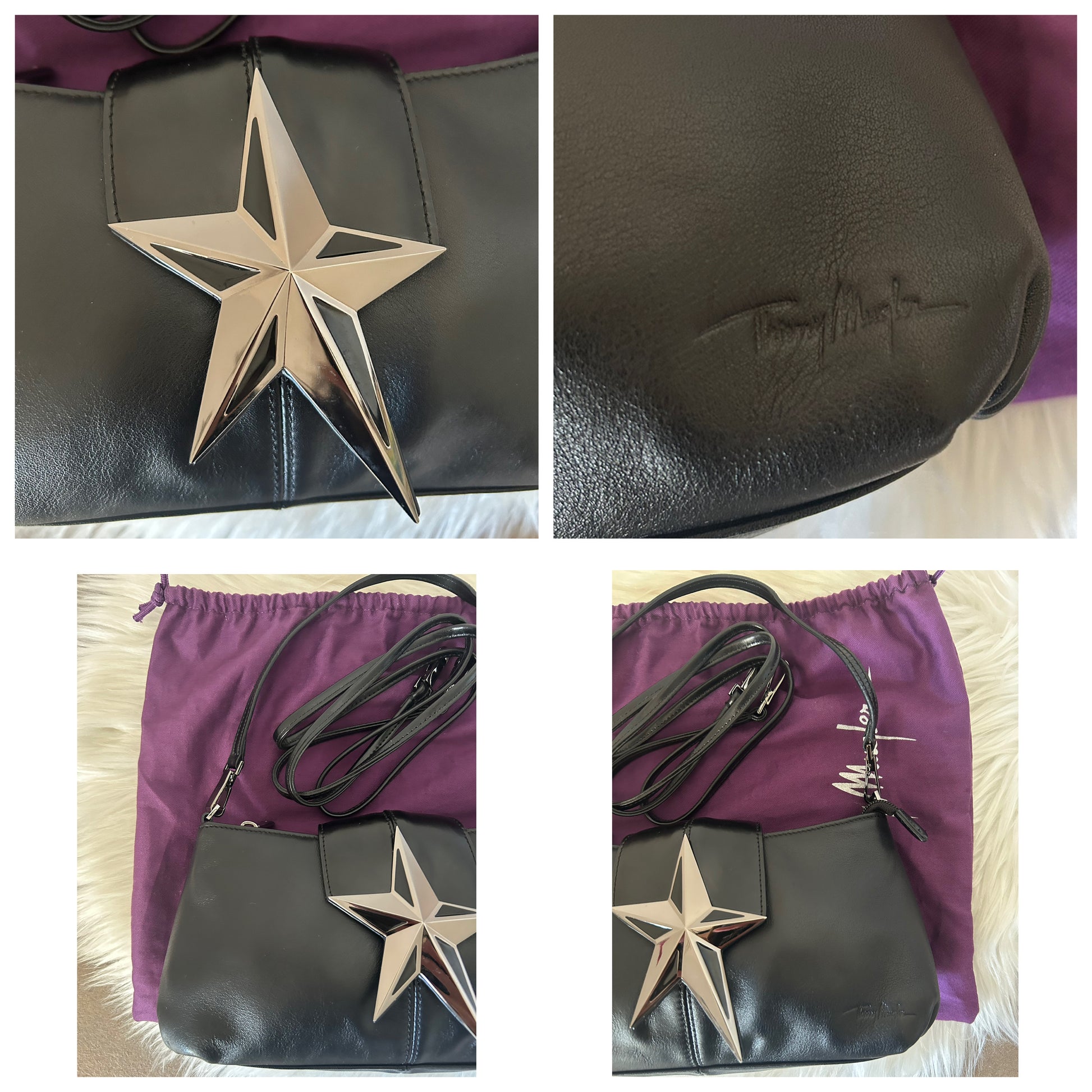 Baguette Thierry Mugler in pelle nera da portare a spalla o a tracolla. La borsa si presenta esattamente nelle condizioni mostrate in foto, si prega di guardarle attentamente poiché eventuali difetti o imperfezioni sono sempre mostrati. Il prezzo tiene sempre conto delle condizioni della borsa. Ogni articolo viene sempre igienizzato prima di essere spedito.