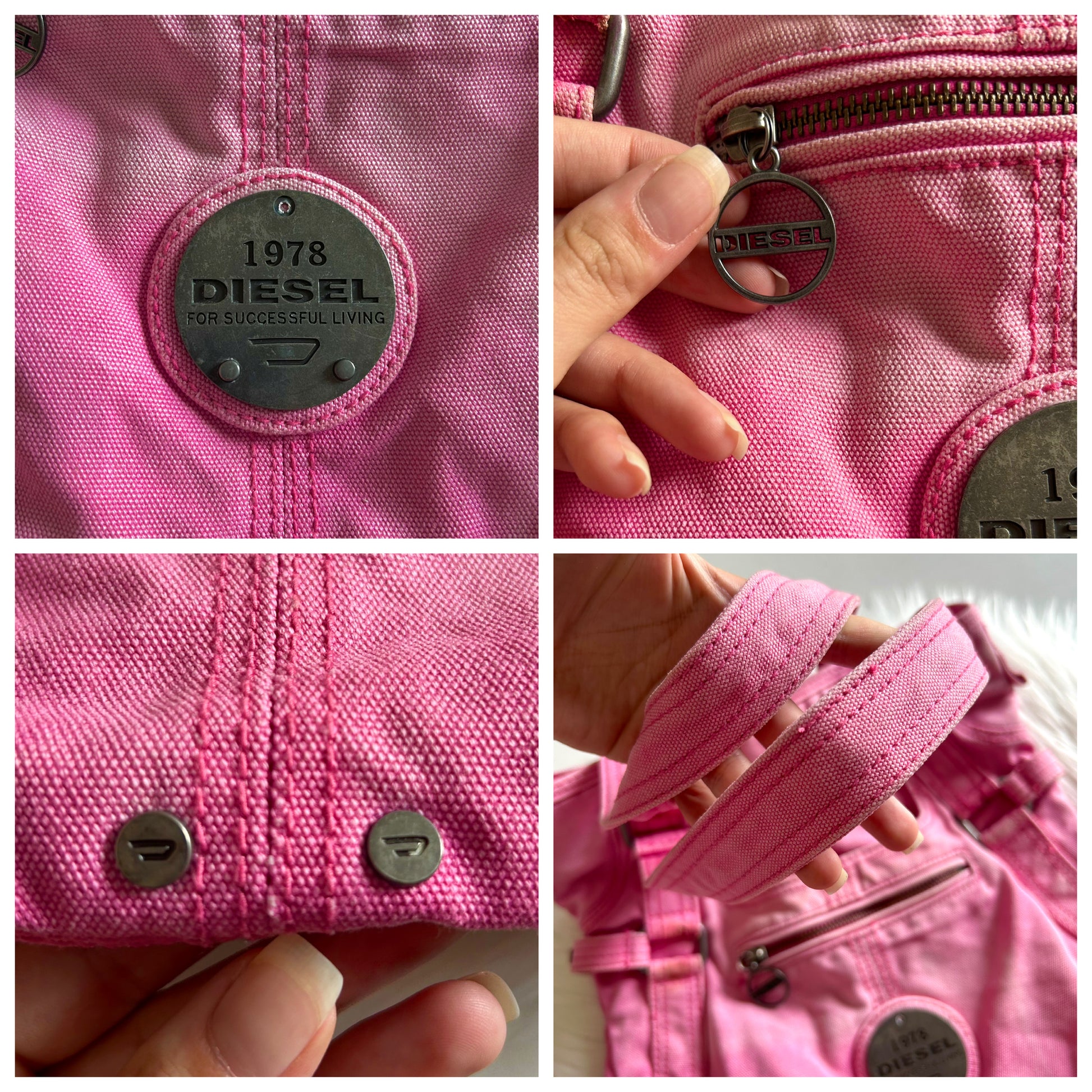 Tote bag Diesel vintage rosa denim. La borsa si presenta esattamente come mostrata in foto, ha dei piccoli segni evidenziati sempre nelle foto, all’’esterno e all’interno, ma nel complesso è davvero in buone condizioni!