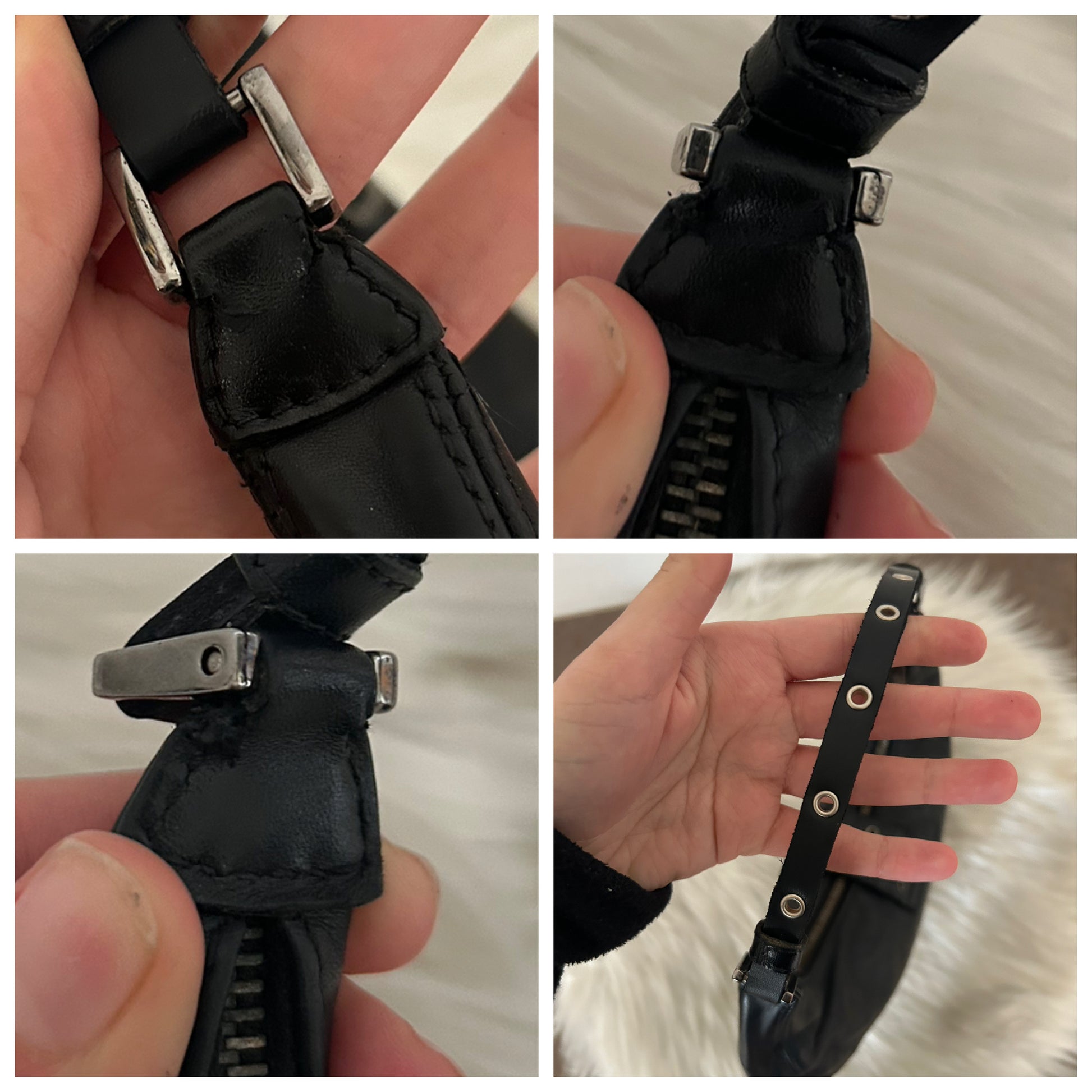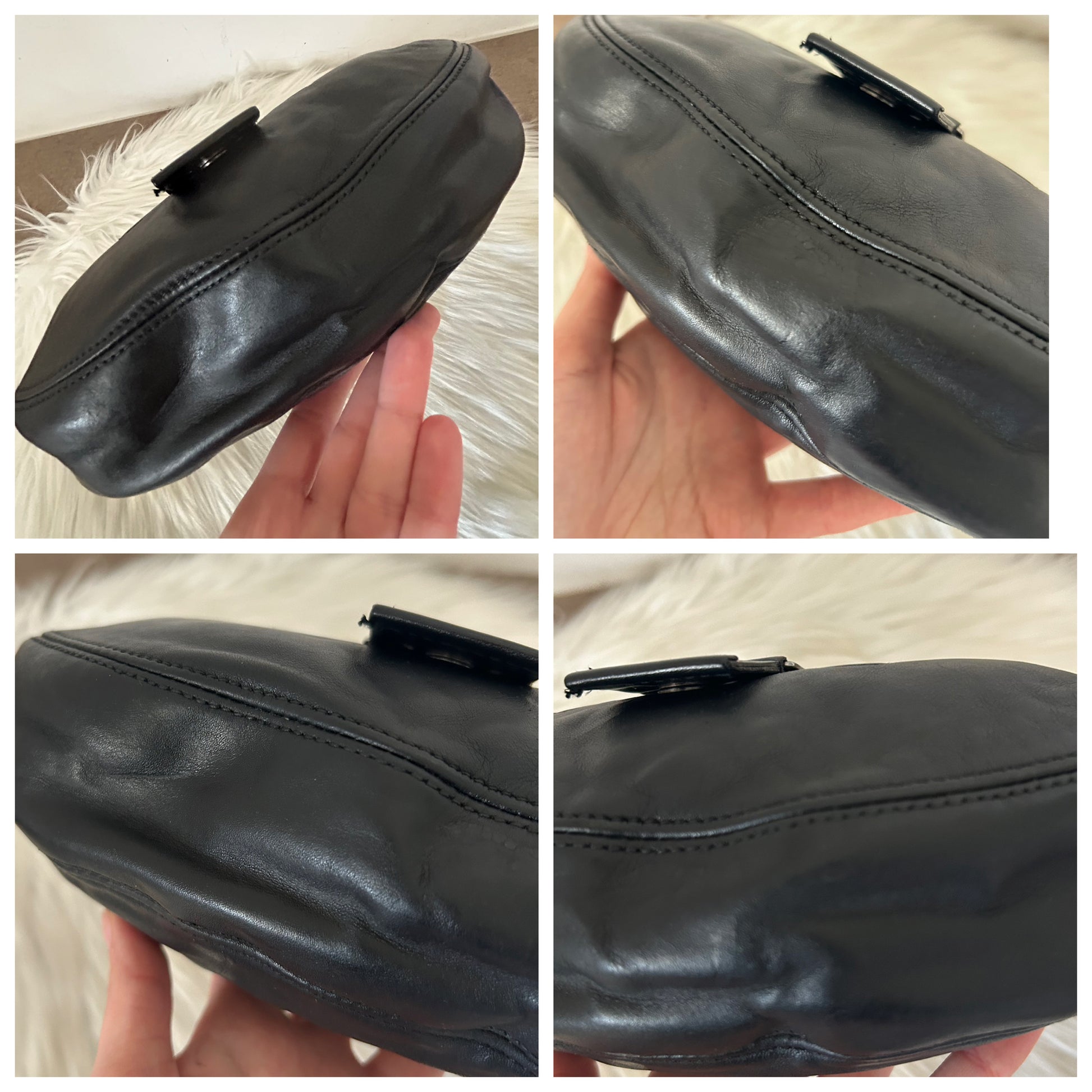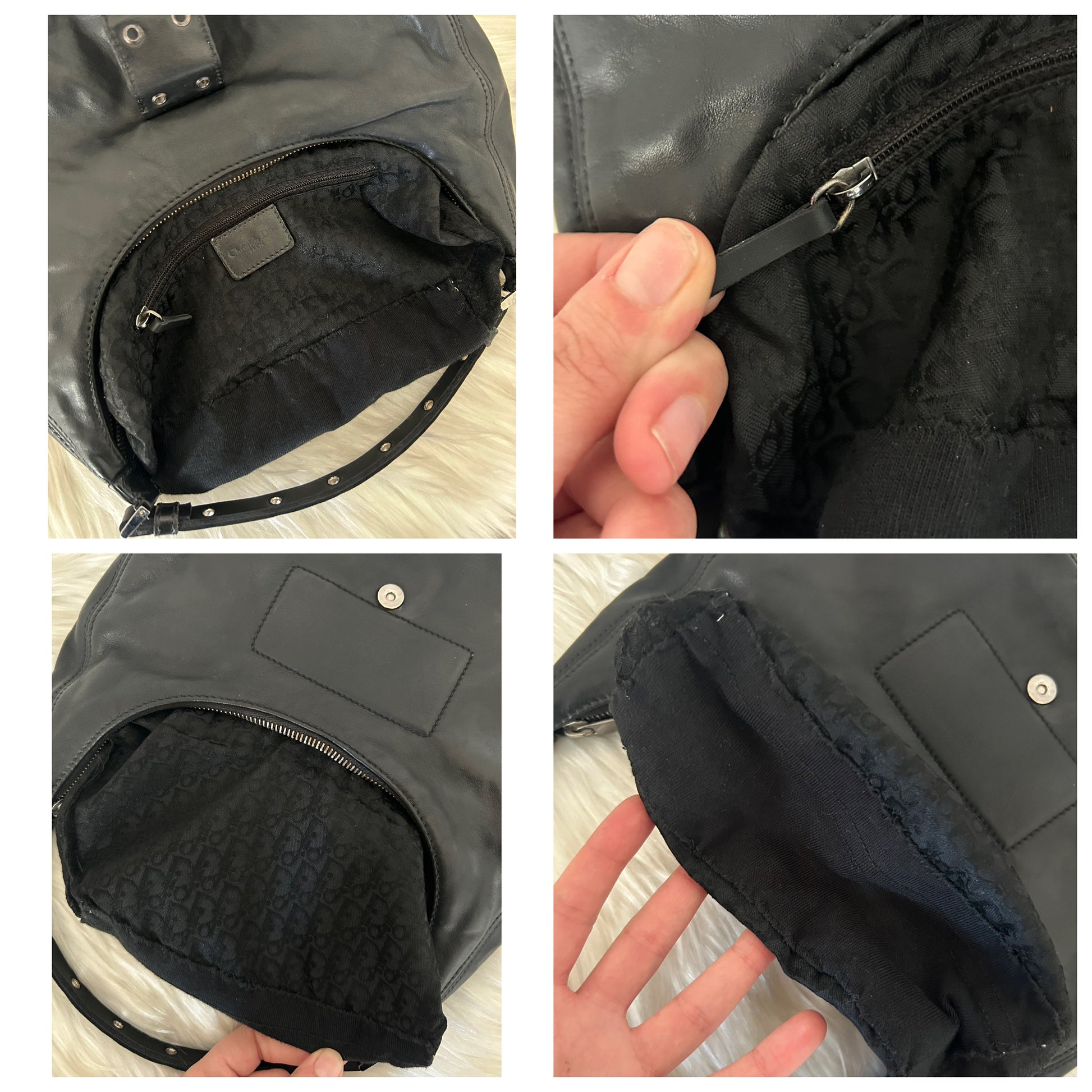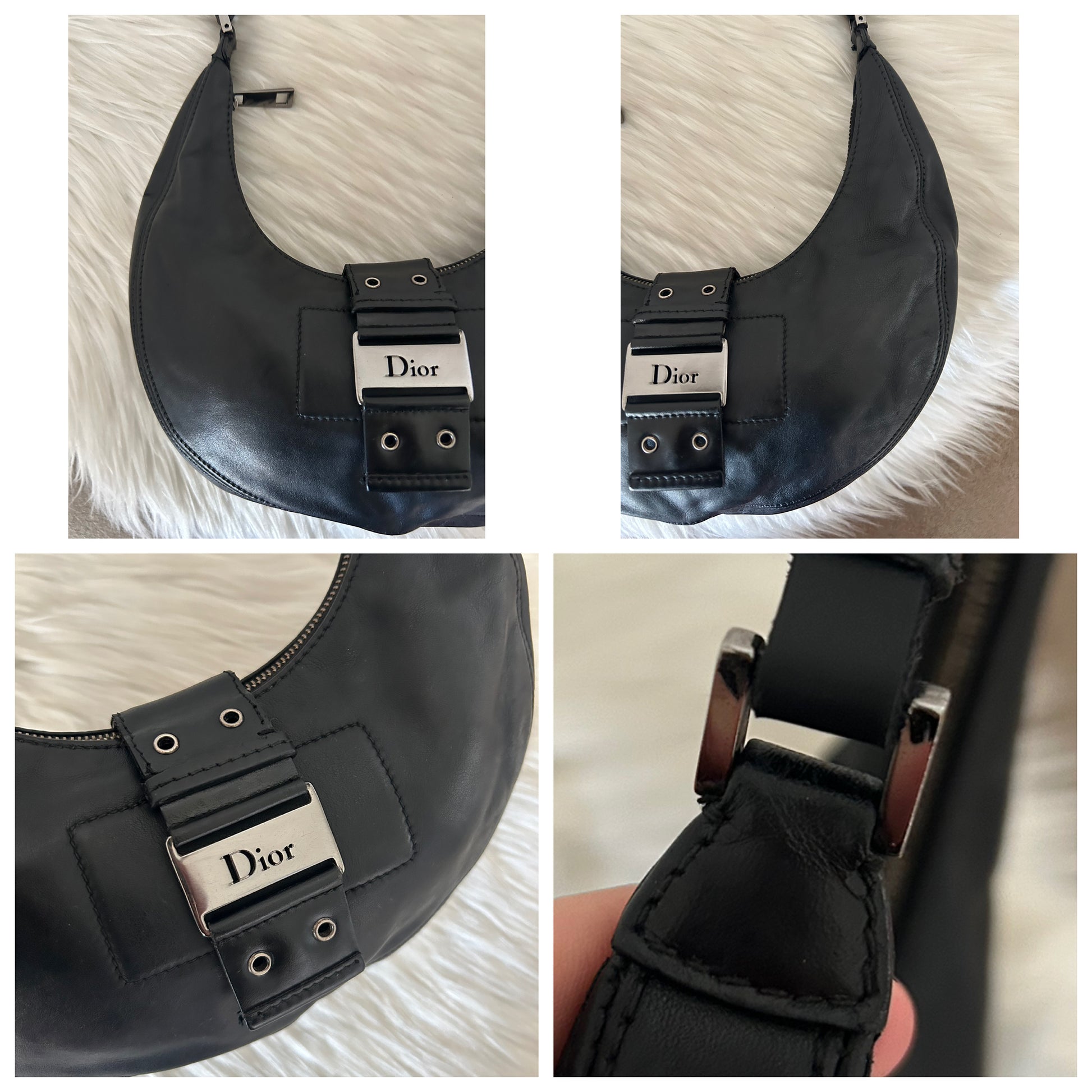 Dior Street Chic in pelle nera vintage. Segnalo che il manico è stato fatto rifare da un esperto del settore che ha prelevato le borchie presenti dal manico precedente e che all’interno è stato inserito e cucito un pezzo di stoffa aggiuntivo. Inoltre anche le zip sono state sostituite. La borsa si presenta esattamente nelle condizioni mostrate in foto, si prega di guardarle attentamente poiché eventuali difetti o imperfezioni sono sempre mostrati. Il prezzo tiene sempre conto delle condizioni della borsa considerando che è venduta online ad un prezzo medio di 1000€. Ogni articolo viene sempre igienizzato prima di essere spedito.