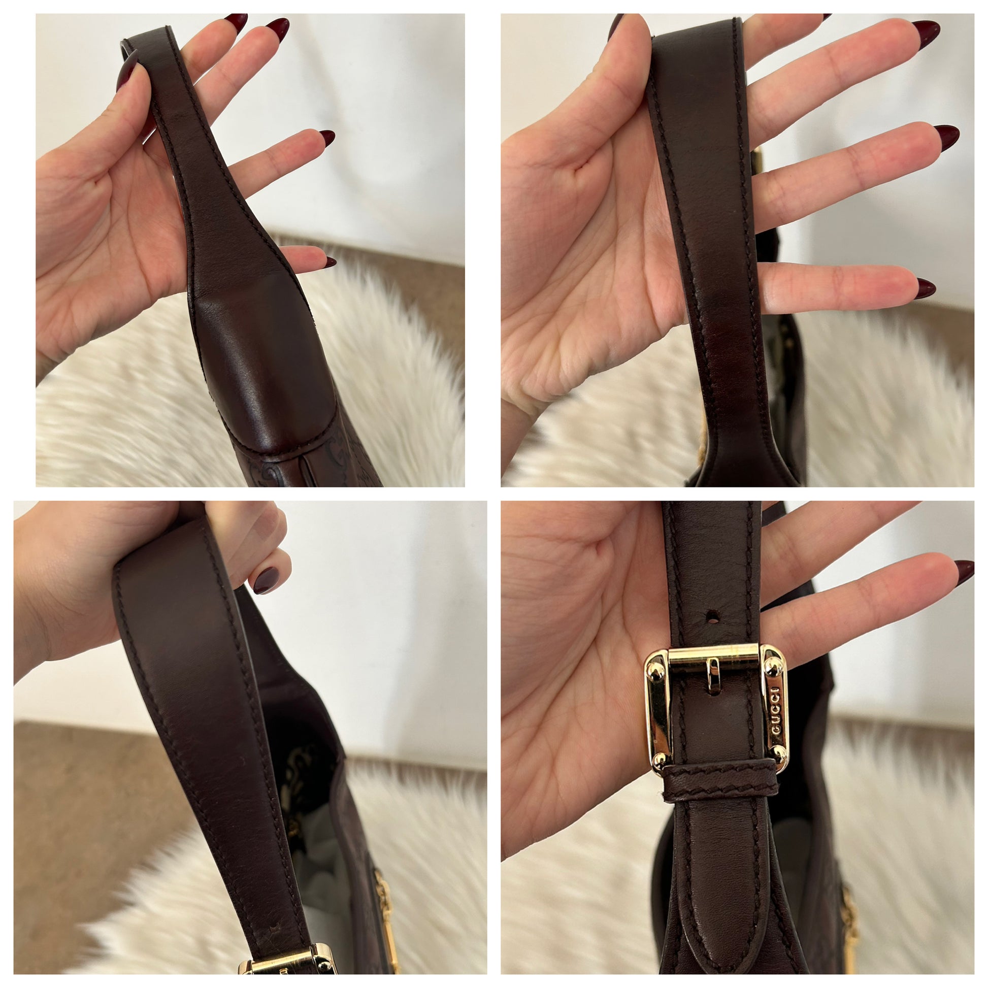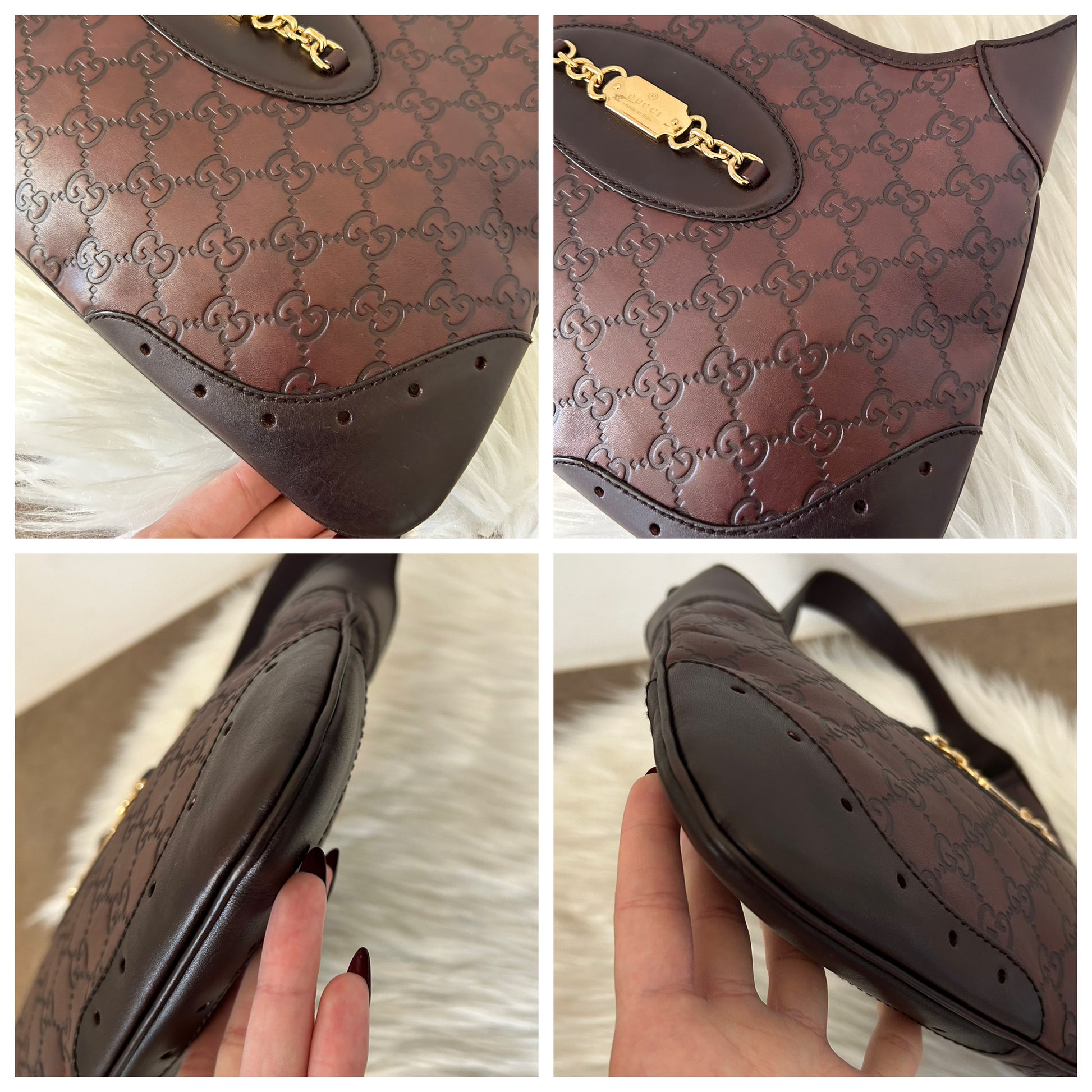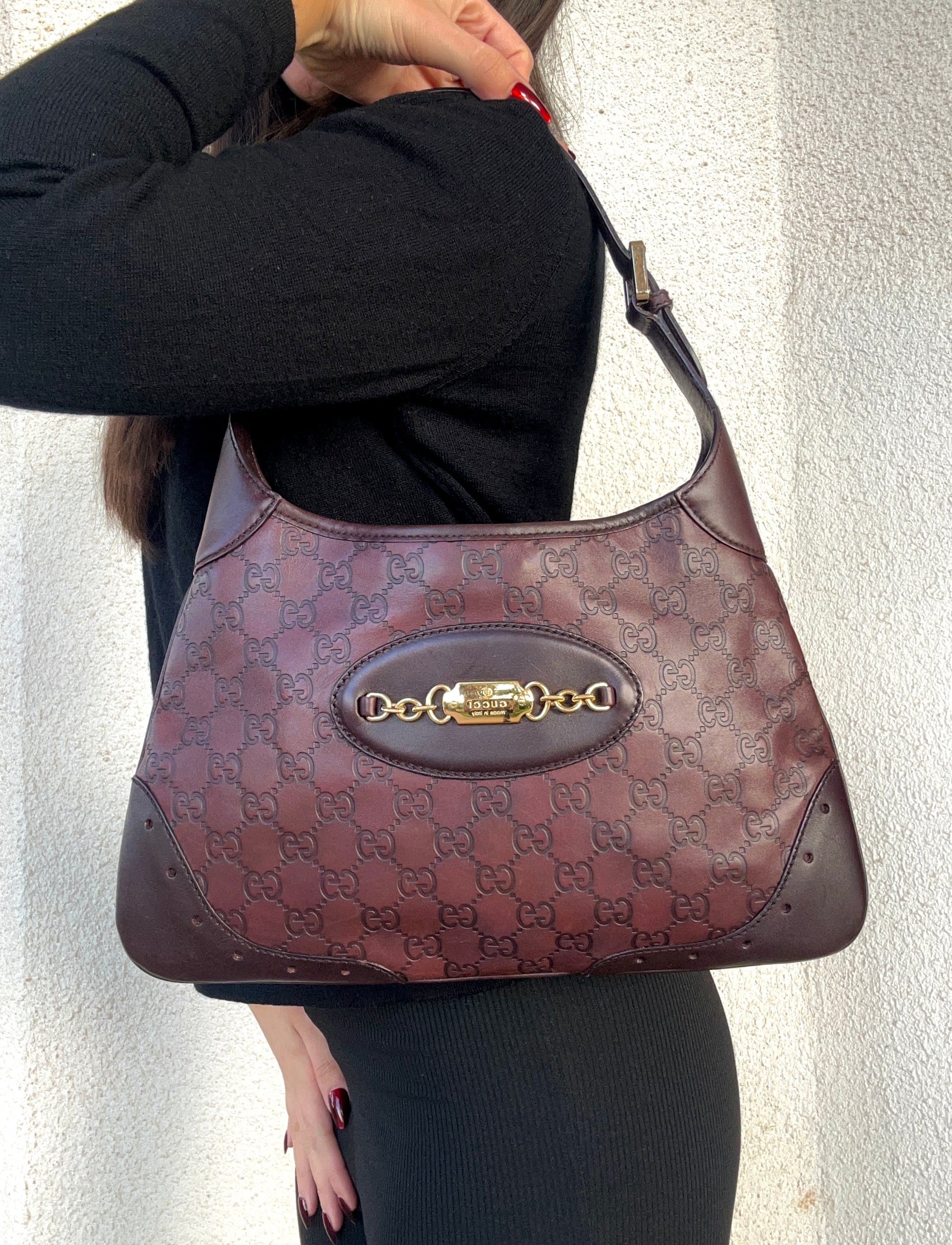 Gucci Jackie in pelle color vinaccia. La borsa si presenta esattamente nelle condizioni mostrate in foto, si prega di guardarle attentamente poiché eventuali difetti o imperfezioni sono sempre mostrati. Il prezzo tiene sempre conto delle condizioni della borsa.