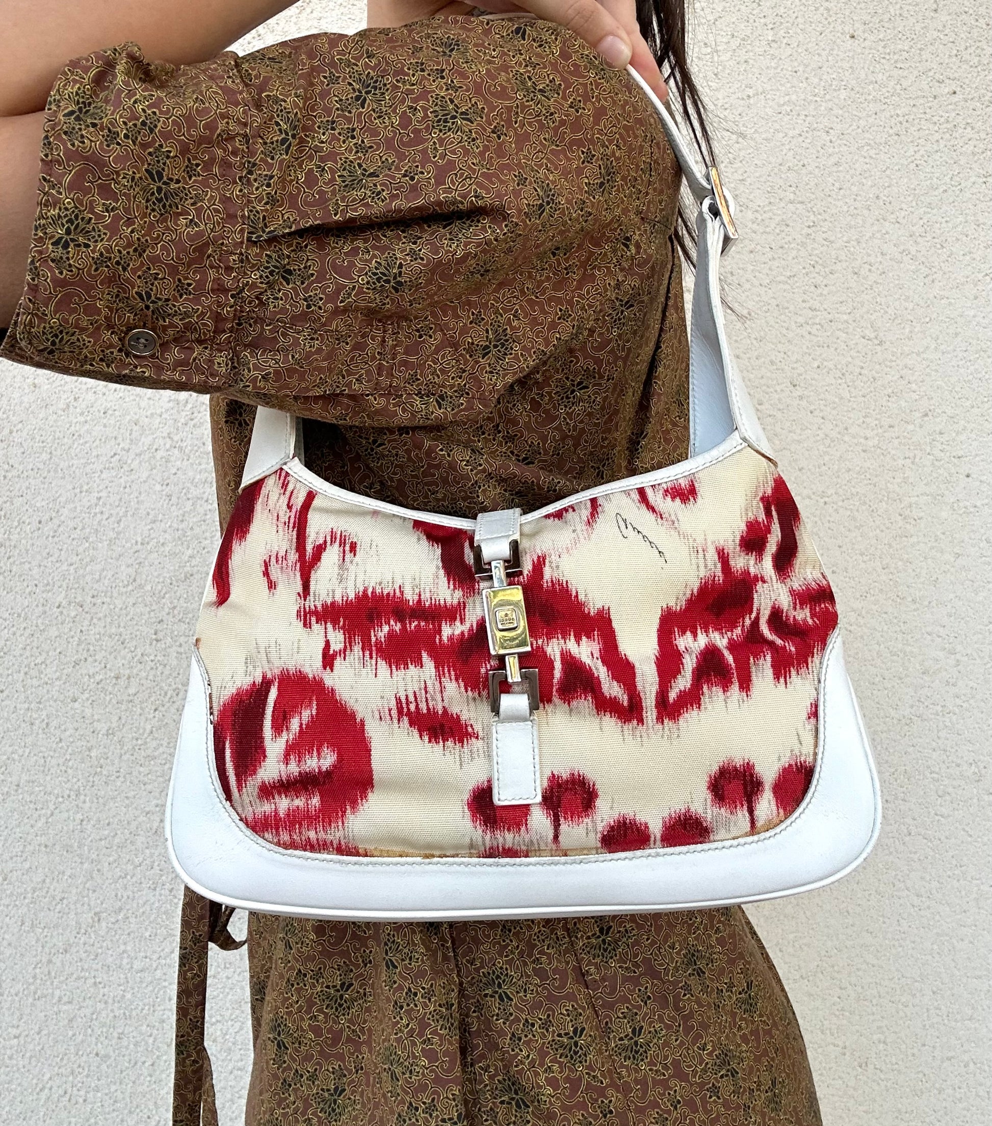 Gucci Jackie vintage rarissima in pelle e tela. La borsa si presenta esattamente nelle condizioni mostrate in foto, le quali mostrano eventuali difetti o imperfezioni dovute all’utilizzo.