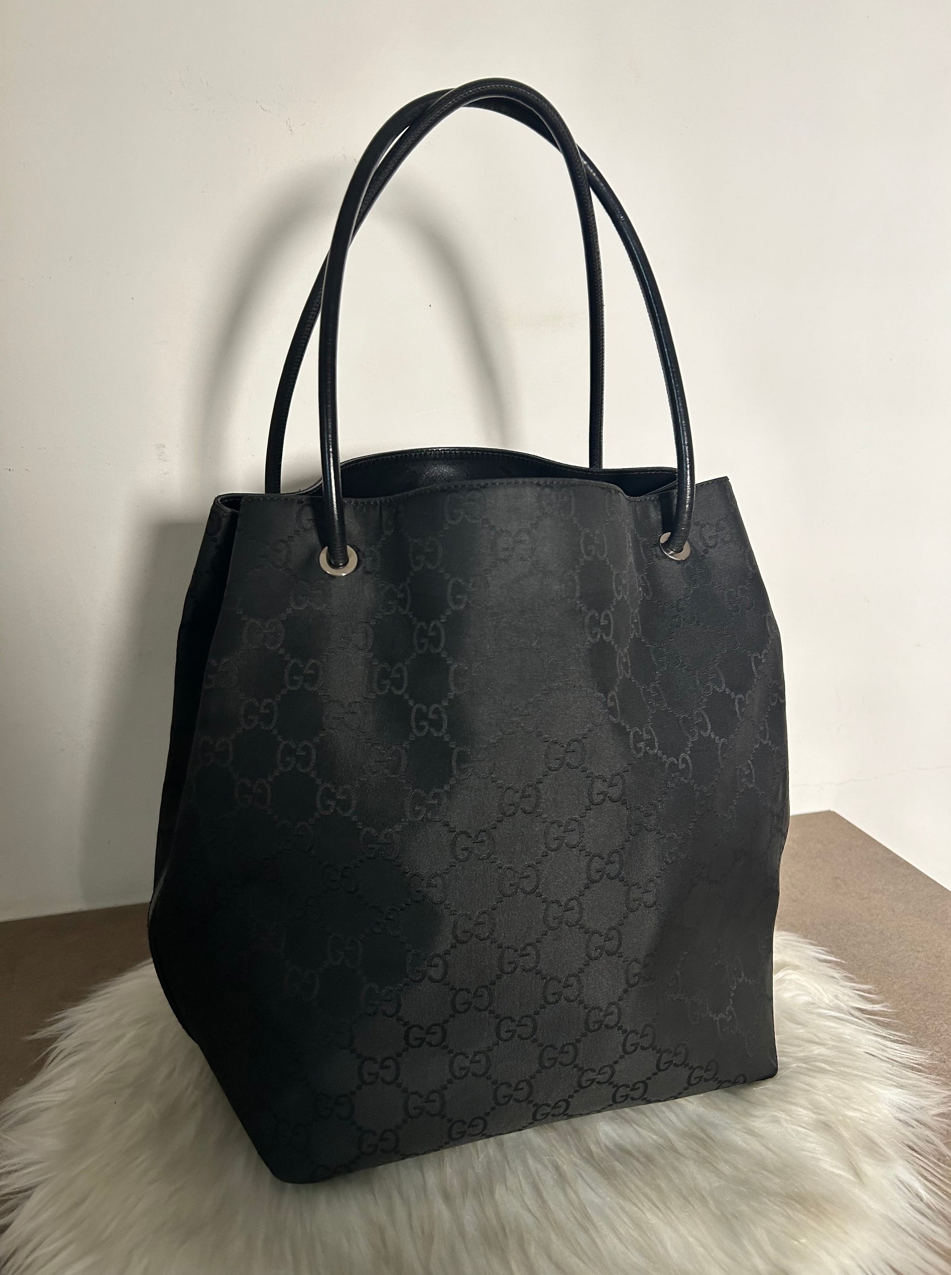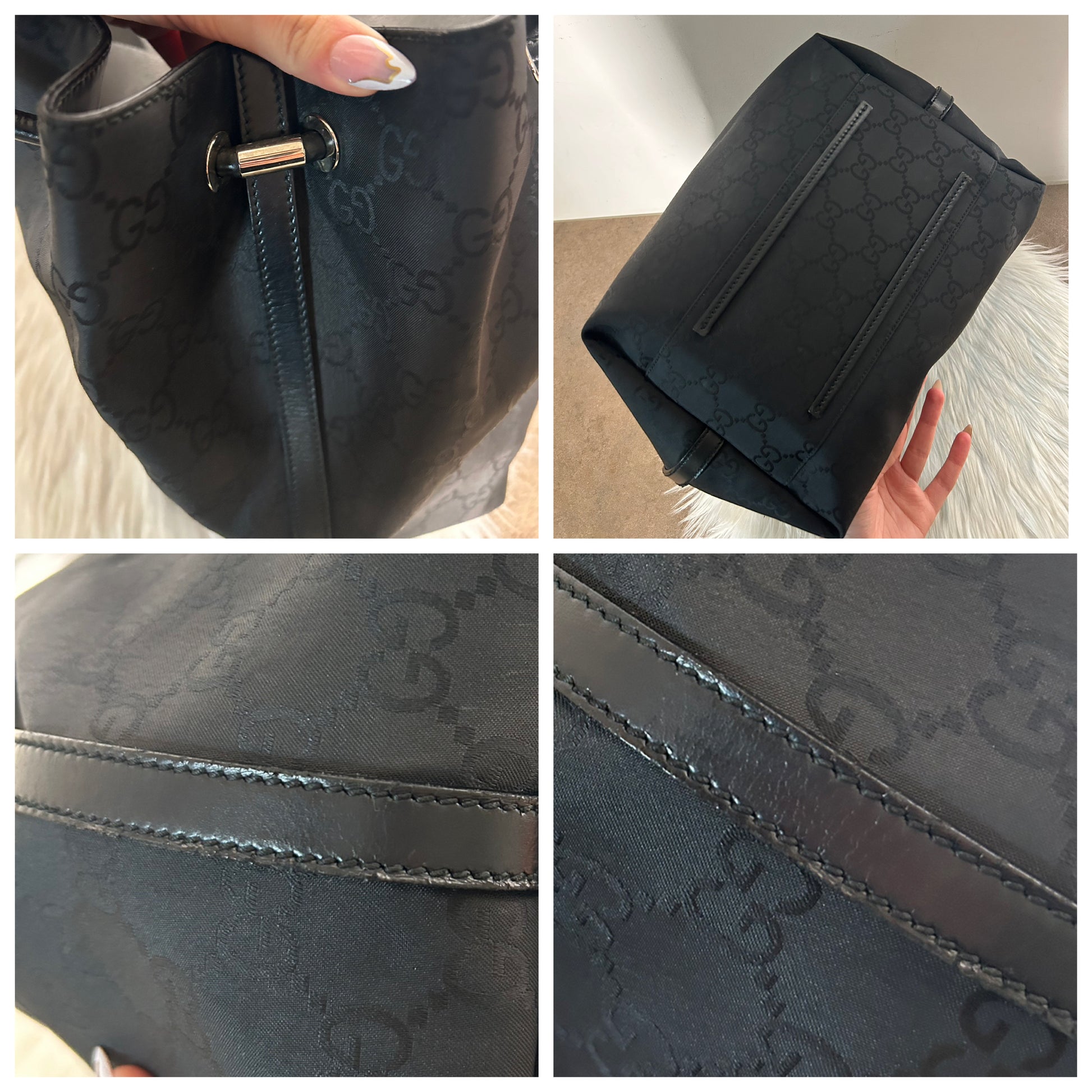 Gucci tote bag nera in monogram. La borsa si presenta esattamente nelle condizioni mostrate in foto, si prega di guardarle attentamente poiché eventuali difetti o imperfezioni sono sempre mostrati. Il prezzo tiene sempre conto delle condizioni della borsa. Ogni articolo viene sempre igienizzato prima di essere spedito. Segnalo che gli angoli della borsa sono stati fatti sistemare da un esperto del settore e ora sono perfetti.