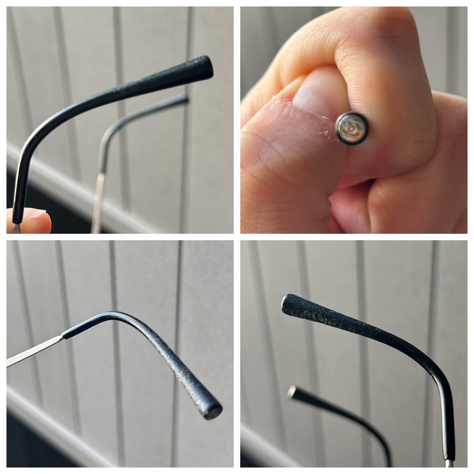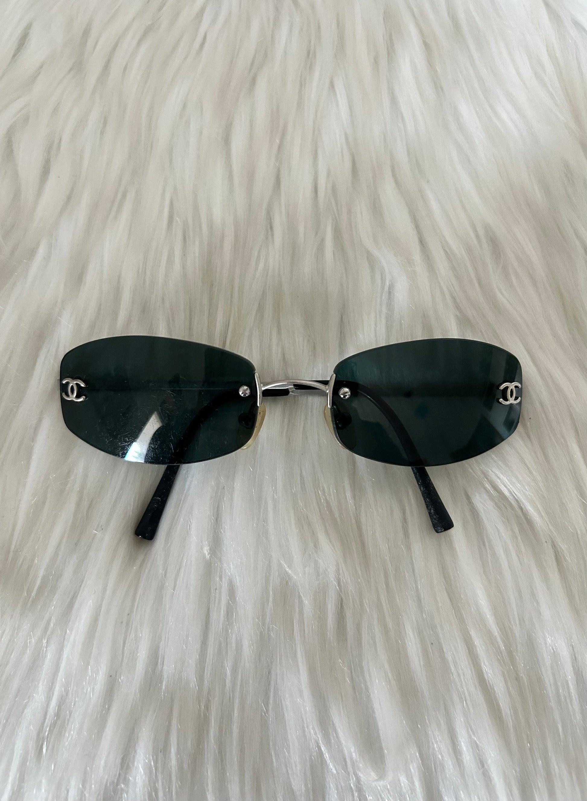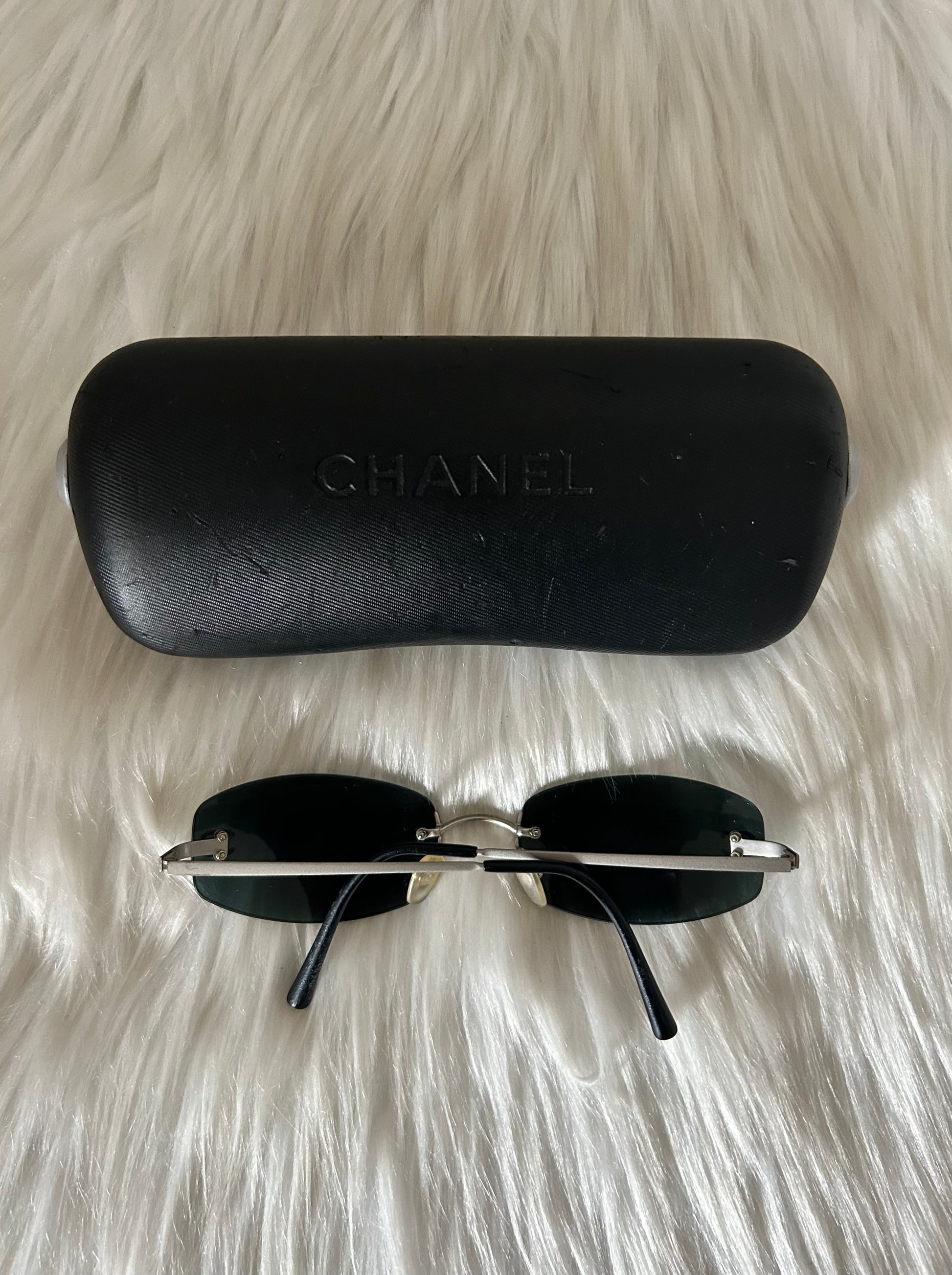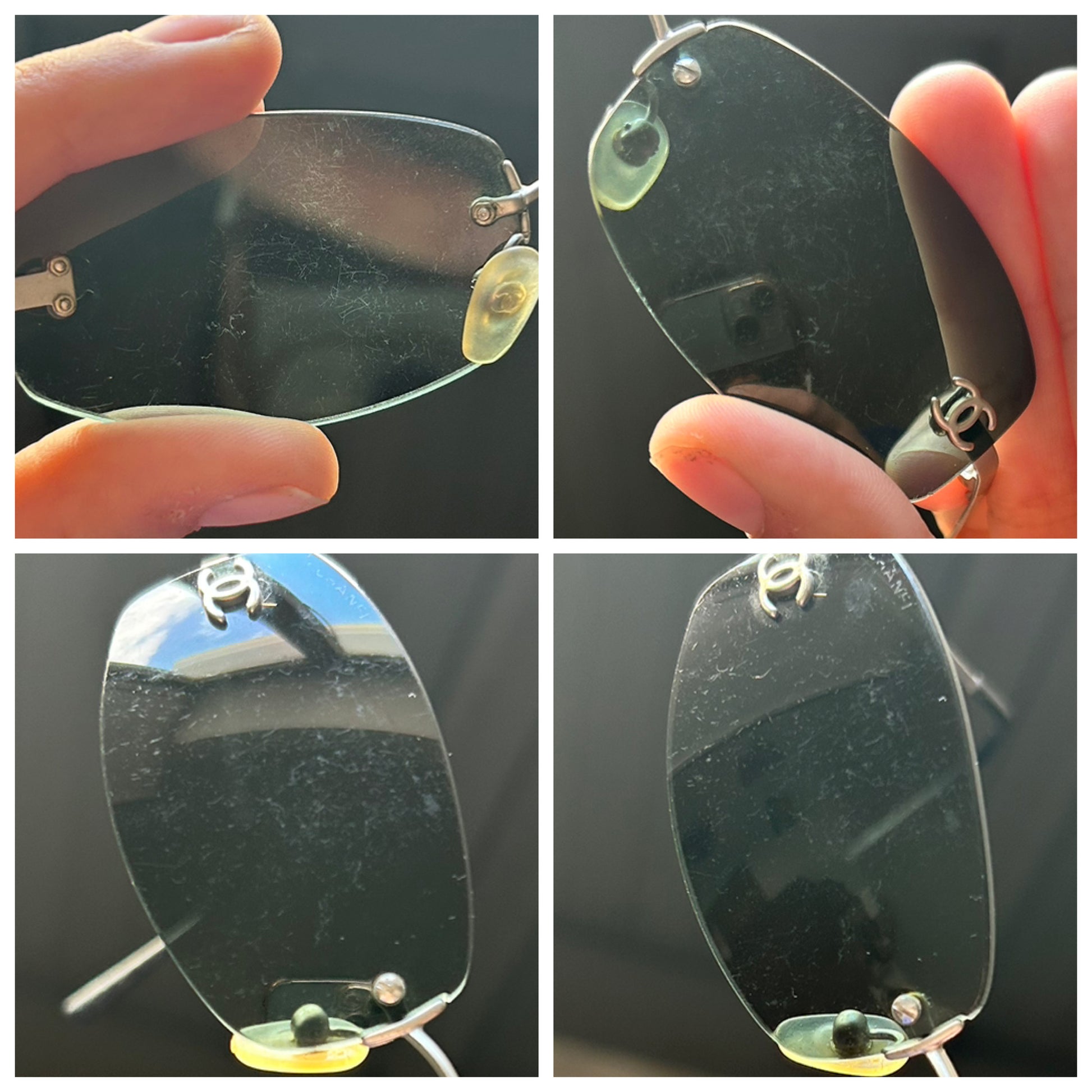Occhiali vintage Chanel con lenti nere e custodia. Gli occhiali si presentano esattamente nelle condizioni mostrate in foto, si prega di guardarle attentamente poiché eventuali difetti o imperfezioni sono sempre mostrati. Il prezzo tiene sempre conto delle condizioni dell’articolo. Come si vede in foto, da indossati, non si notano i graffietti interni.