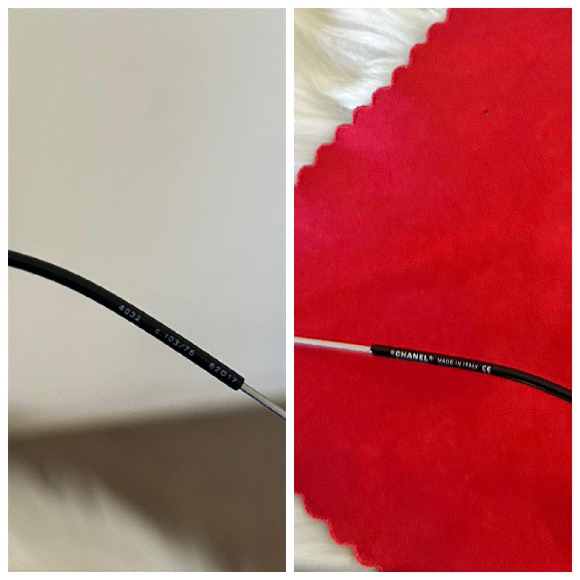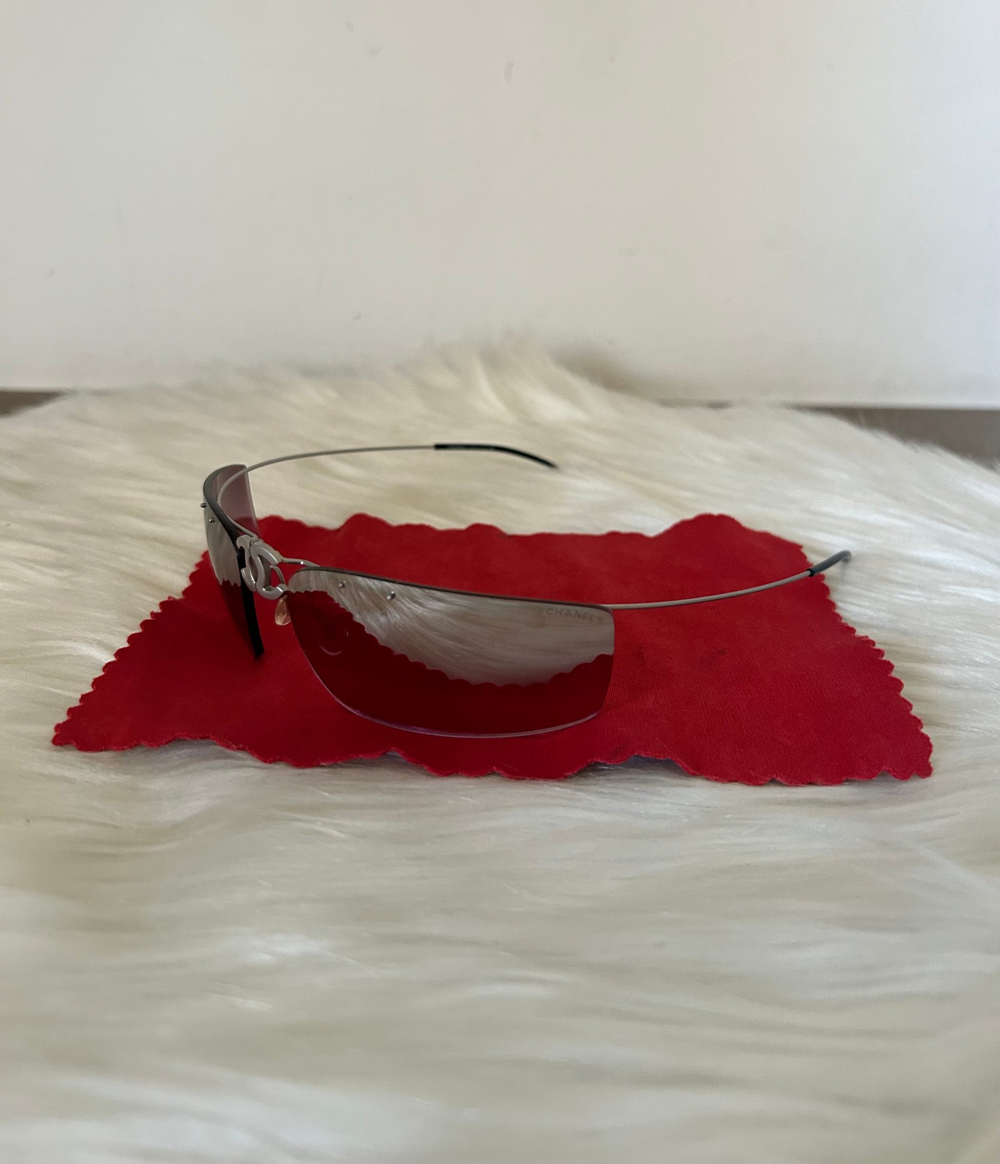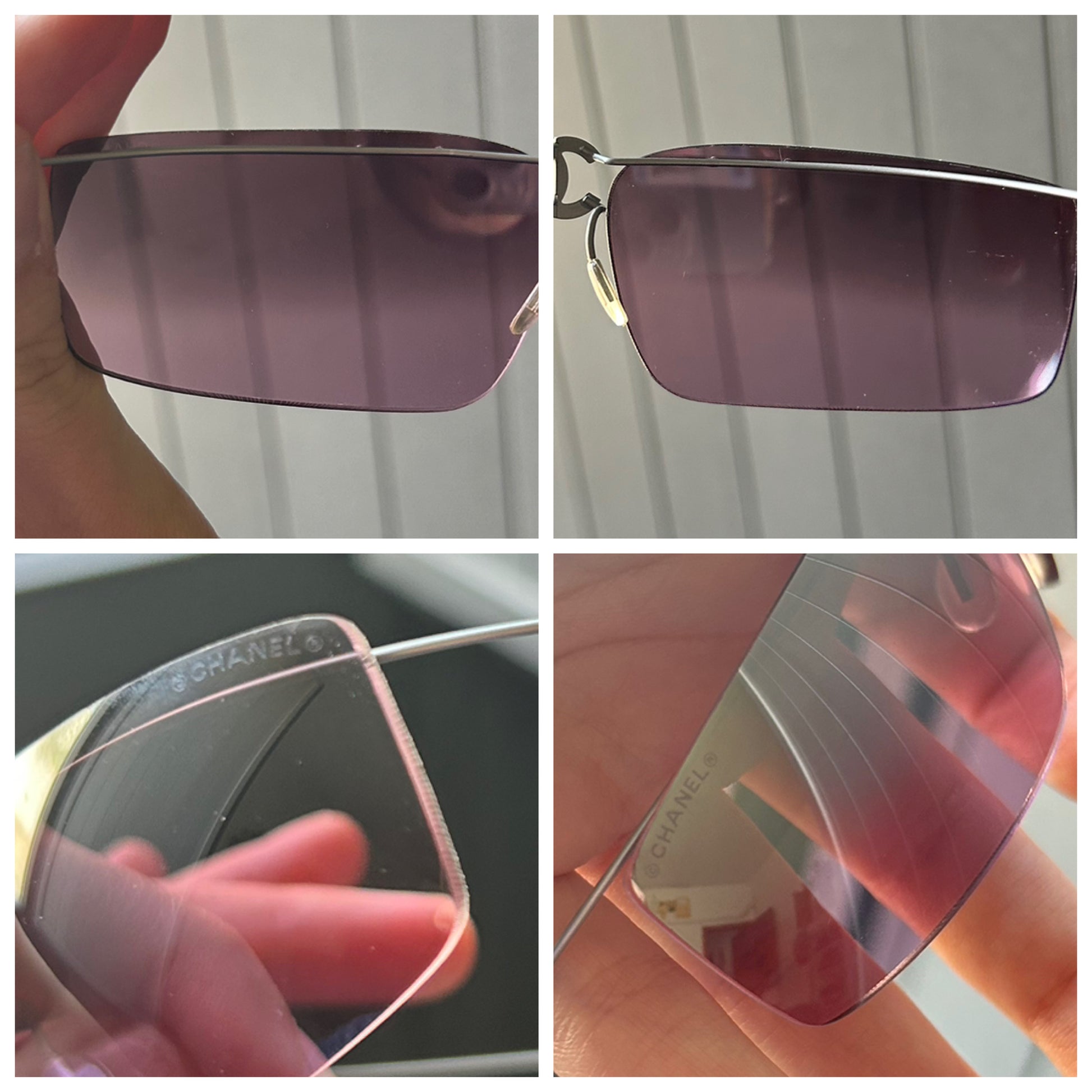Occhiali vintage Chanel con lenti rosate e logo centrale. Gli occhiali si presentano esattamente nelle condizioni mostrate in foto, si prega di guardarle attentamente poiché eventuali difetti o imperfezioni sono sempre mostrati. Il prezzo tiene sempre conto delle condizioni dell’articolo.