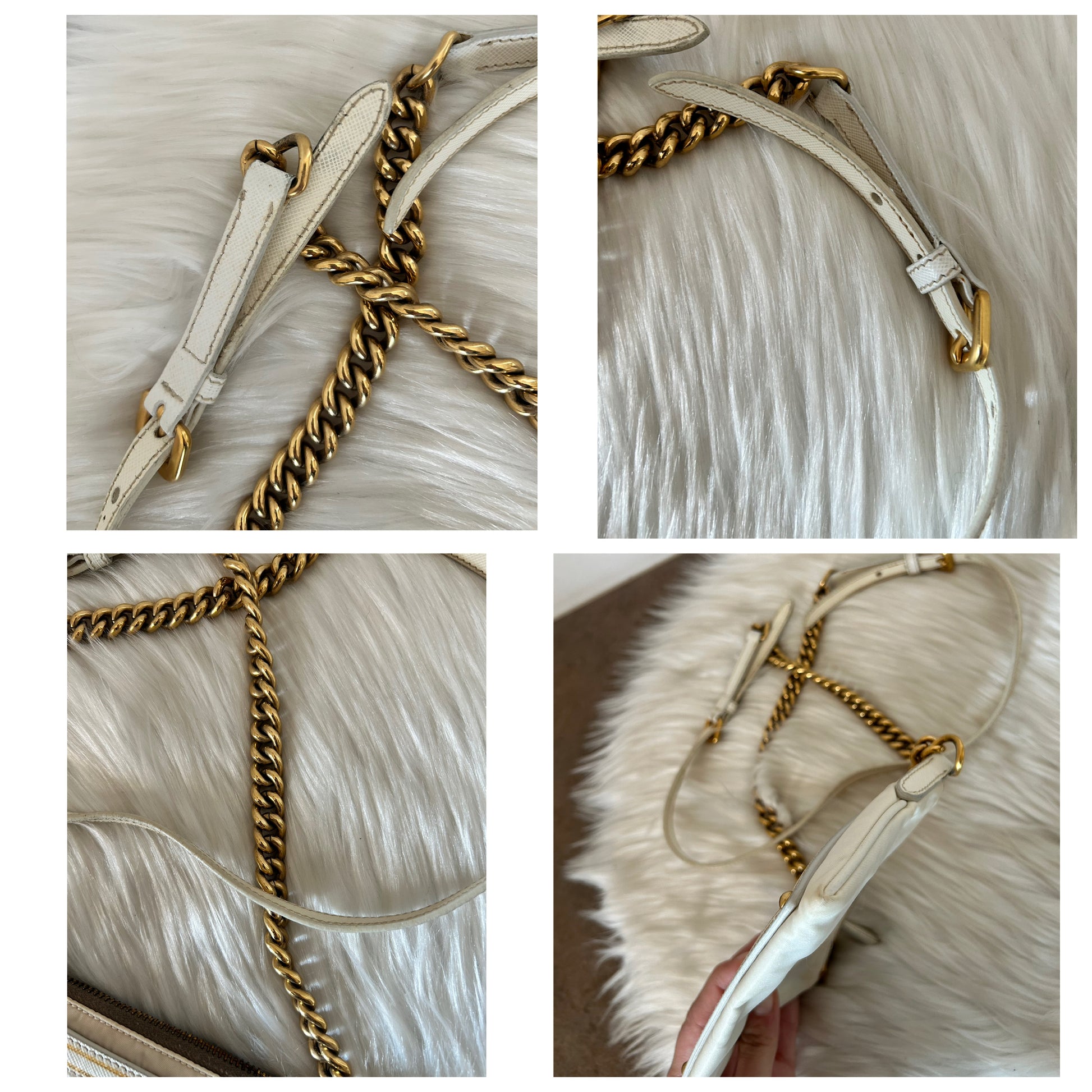 Prada in nylon bianca e pelle vintage. La borsa si presenta esattamente nelle condizioni mostrate in foto, si prega di guardarle attentamente poiché eventuali difetti o imperfezioni sono sempre mostrati. Il prezzo tiene sempre conto delle condizioni della borsa. Il sotto della zip si presenta ossidato, ma si apre e si chiude tranquillamente senza problemi.