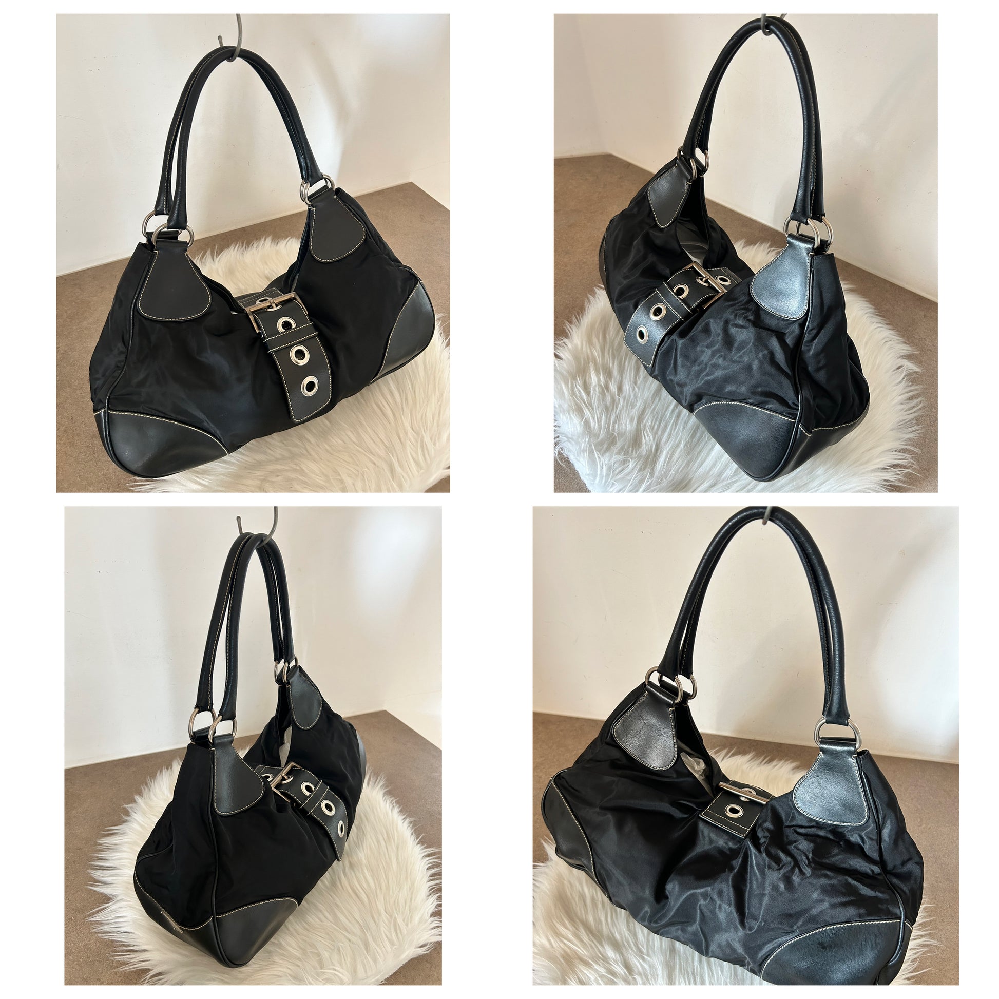 Prada modello Moon in pelle e nylon nera. La borsa si presenta esattamente nelle condizioni mostrate in foto, si prega di guardarle attentamente poiché eventuali difetti o imperfezioni sono sempre mostrati. Il prezzo tiene sempre conto delle condizioni della borsa. La pelle si presenta leggermente disidratata come da foto, ma nel complesso è in ottime condizioni, negli ultimi giorni ho provveduto ad idratarla più volte con un prodotto adatto. L’etichetta con il numerino bianco all'interno della tasca non è presente in quanto quel punto della fodera è stato fatto riparare da un esperto del settore.