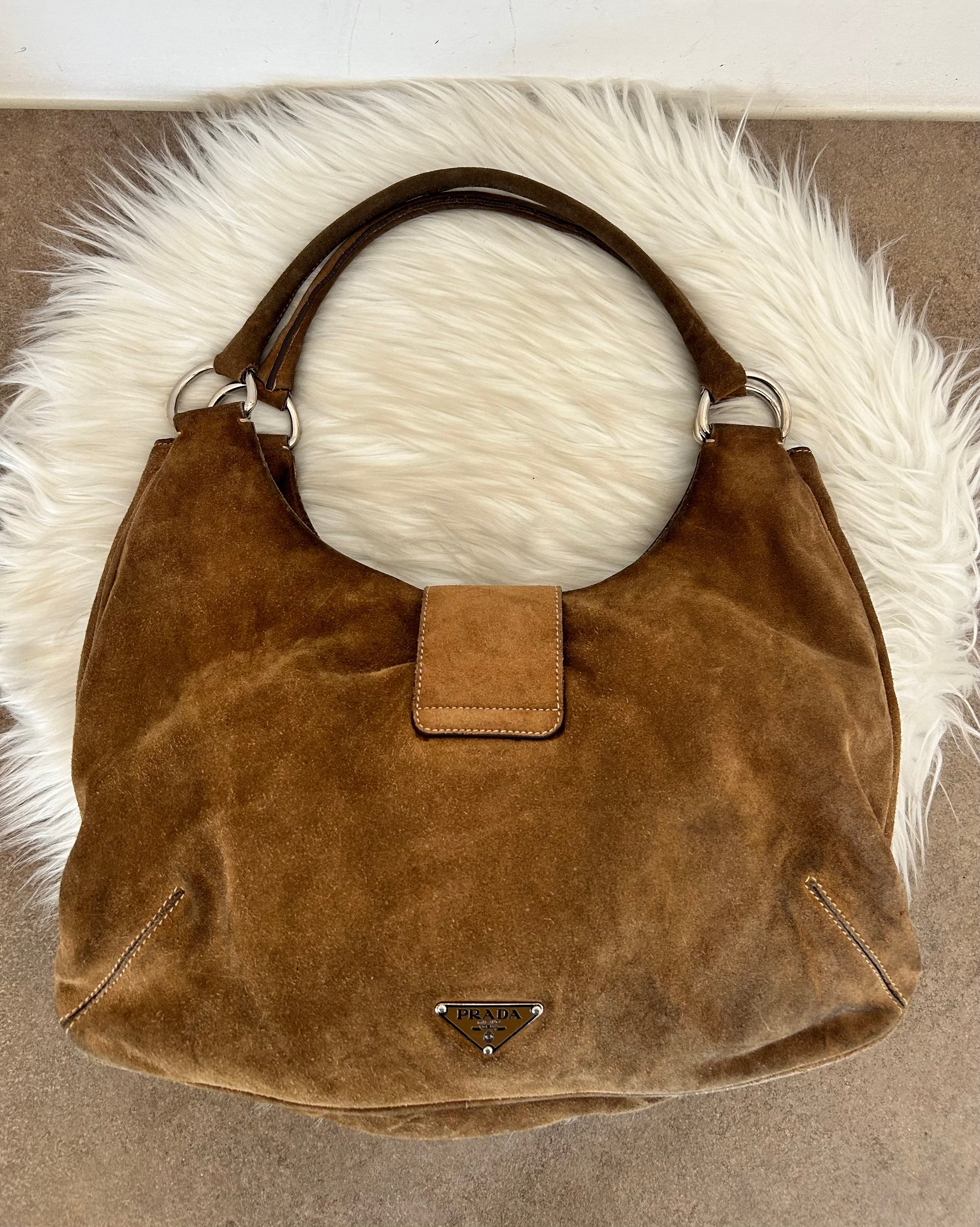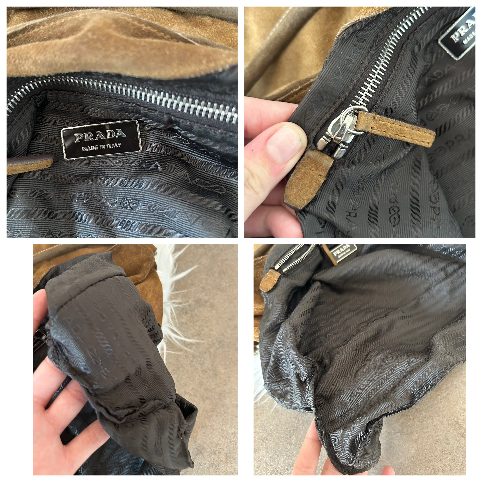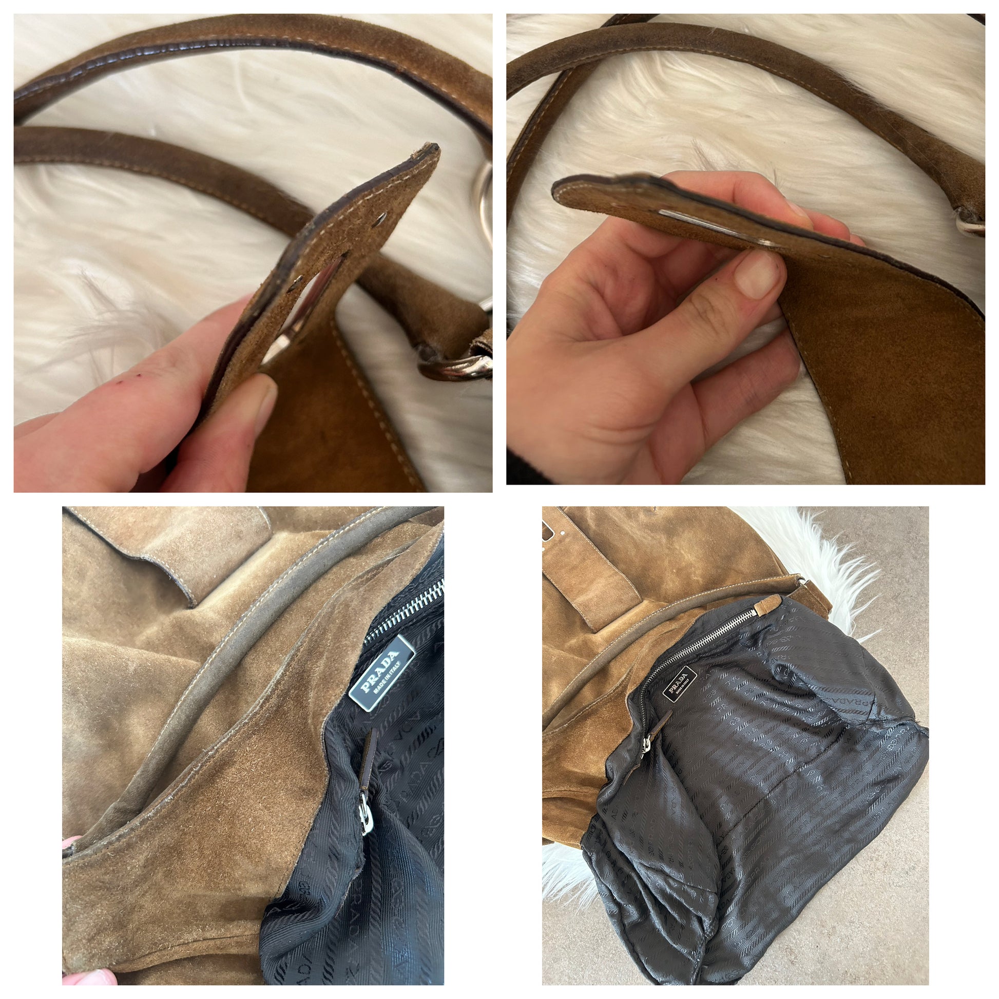 Prada Moon in suede color cammello. La borsa si presenta esattamente nelle condizioni mostrate in foto, si prega di guardarle attentamente poiché eventuali difetti o imperfezioni sono sempre mostrati. Il prezzo tiene sempre conto delle condizioni della borsa. Come si nota da foto, la fodera interna in alcuni punti è stata fatta riparare da un esperto del settore.