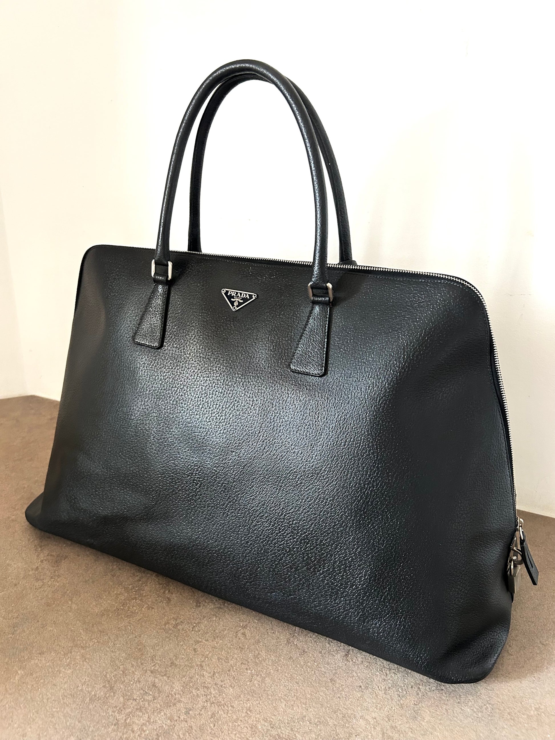 Prada modello Pyramid in pelle nera. borsa si presenta esattamente nelle condizioni mostrate in foto, si prega di guardarle attentamente poiché eventuali difetti o imperfezioni sono sempre mostrati. Il prezzo tiene sempre conto delle condizioni della borsa. Segnalo che che la borsa era inizialmente blu scuro, ma è stata fatta ridipingere di nero da un esperto del settore e che nella tasca interna vi era una piccola scucitura che è stata fatta completamente ricucire.