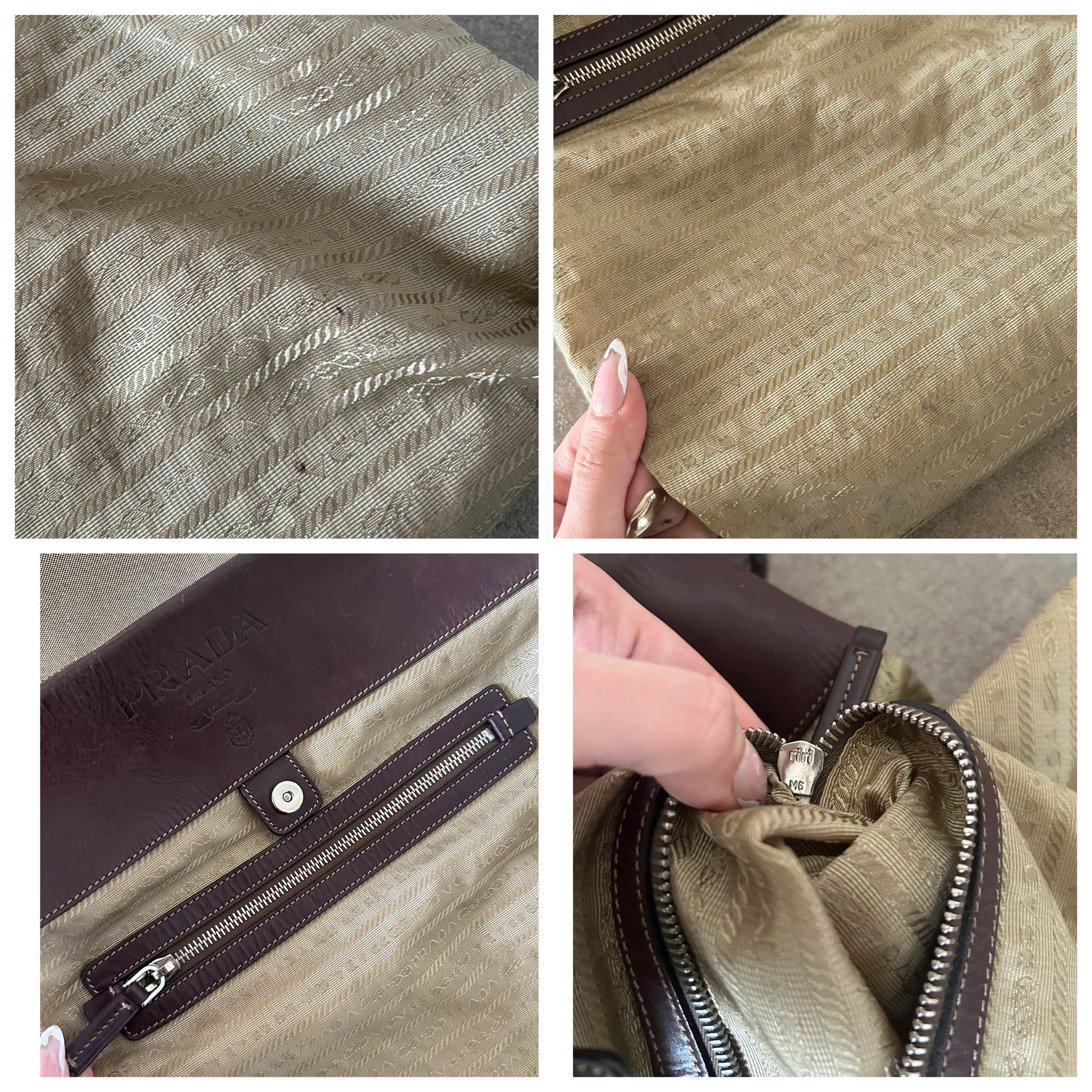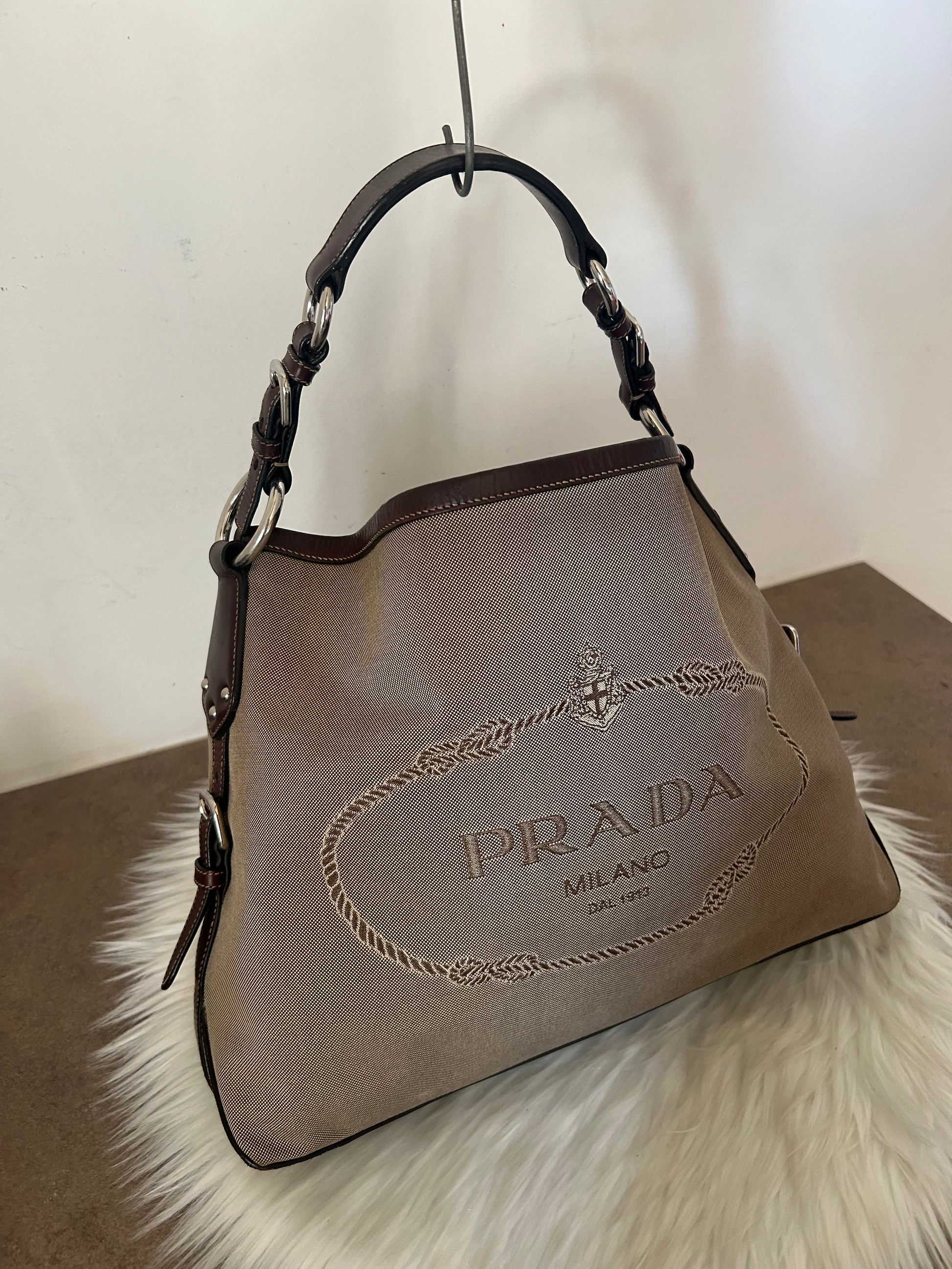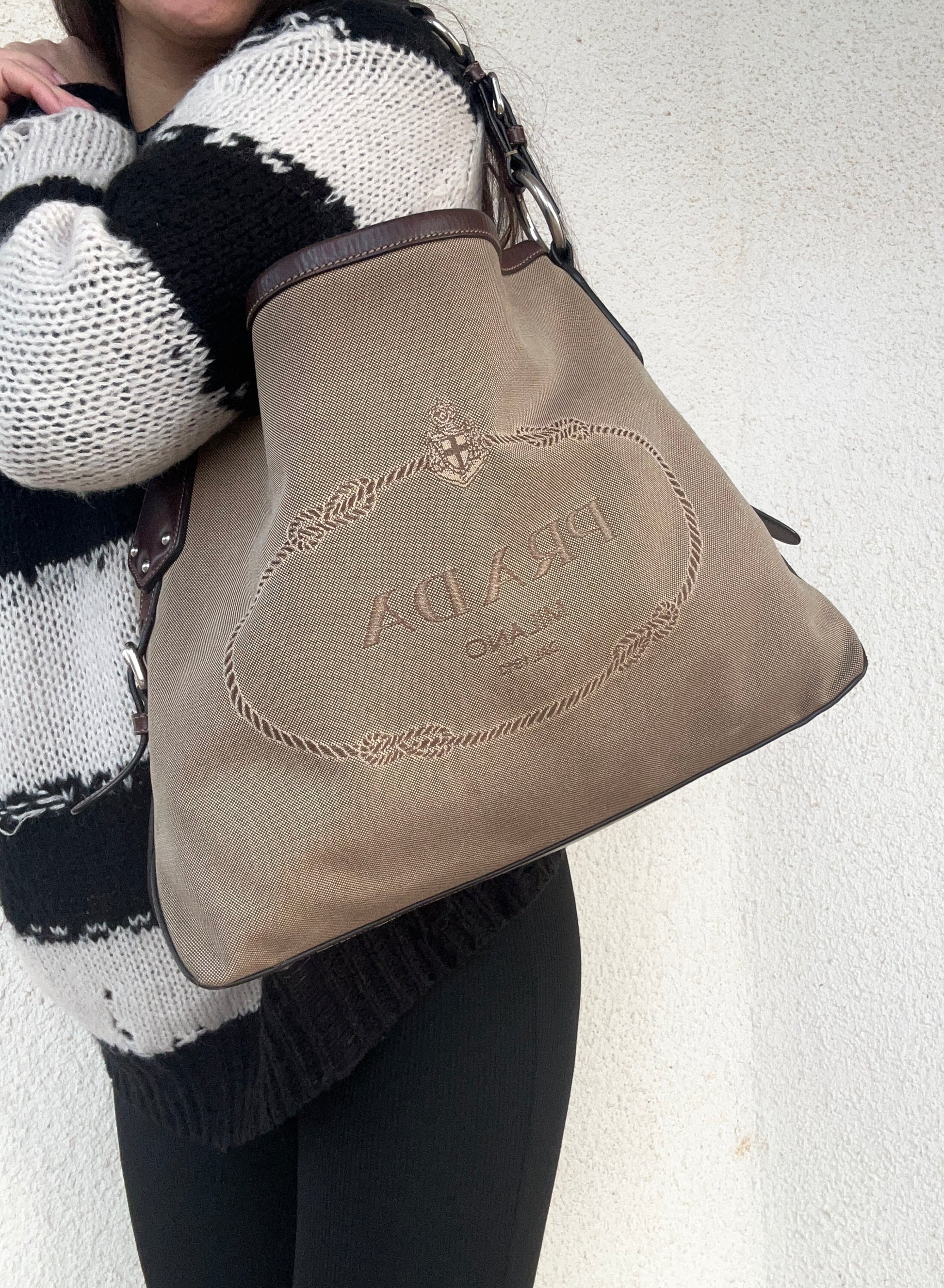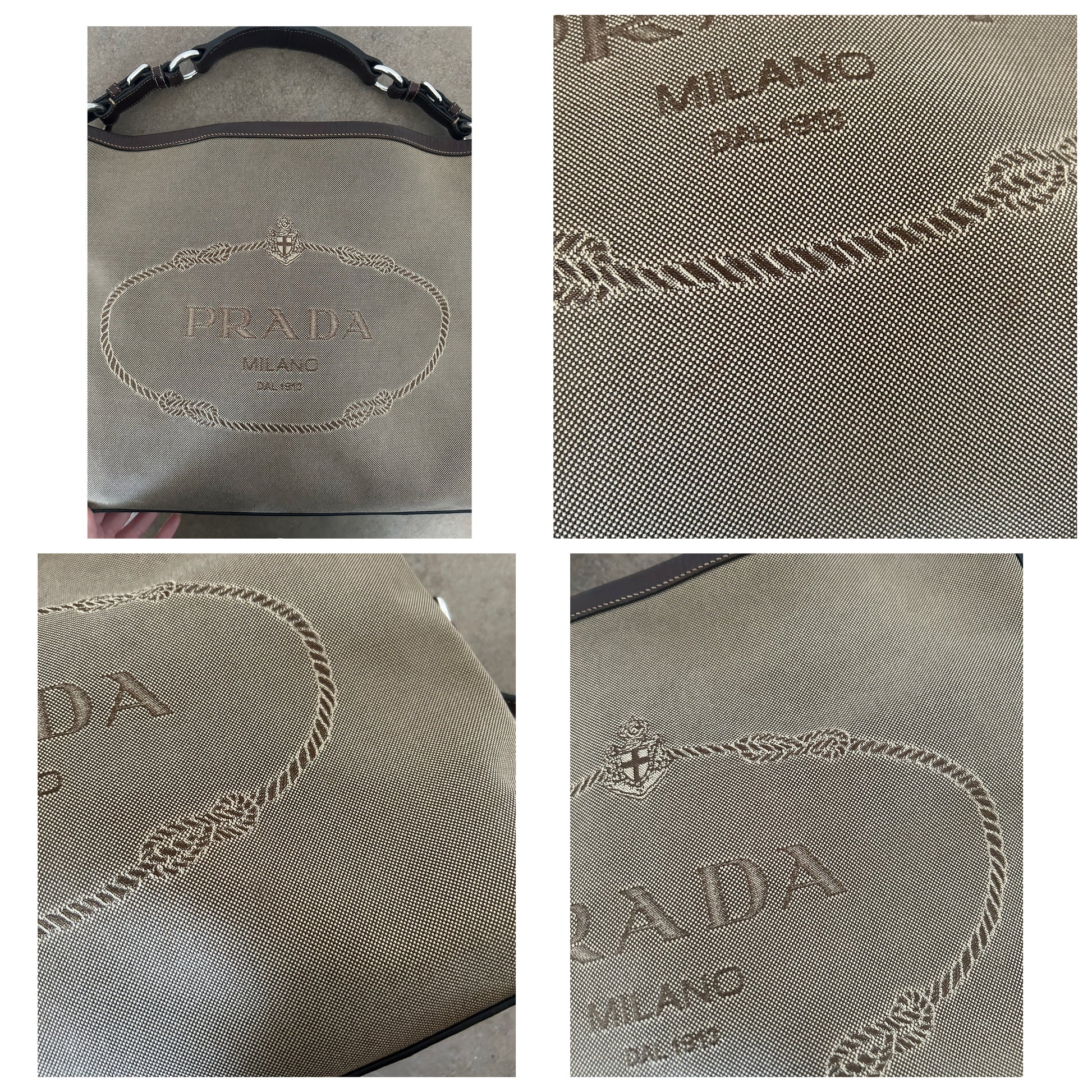 Prada tote bag con motivo corda in tela e pelle. La borsa si presenta esattamente nelle condizioni mostrate in foto, si prega di guardarle attentamente poiché eventuali difetti o imperfezioni sono sempre mostrati. Il prezzo tiene sempre conto delle condizioni della borsa. Ogni articolo viene sempre igienizzato prima di essere spedito.