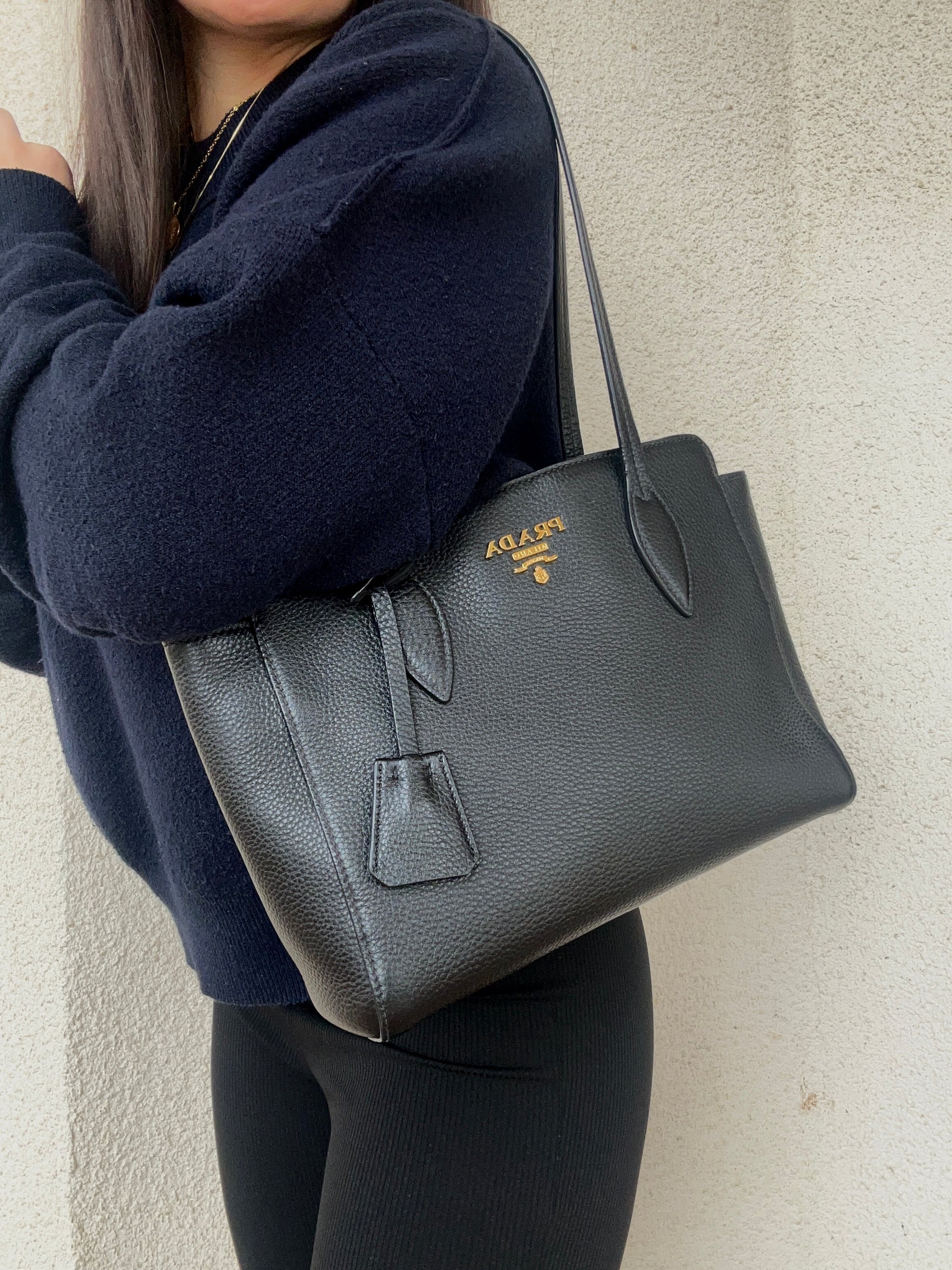 Prada tote in pelle nera saffiano. La borsa si presenta esattamente nelle condizioni mostrate in foto. La borsa è davvero in perfette condizioni come da foto, come nuova.