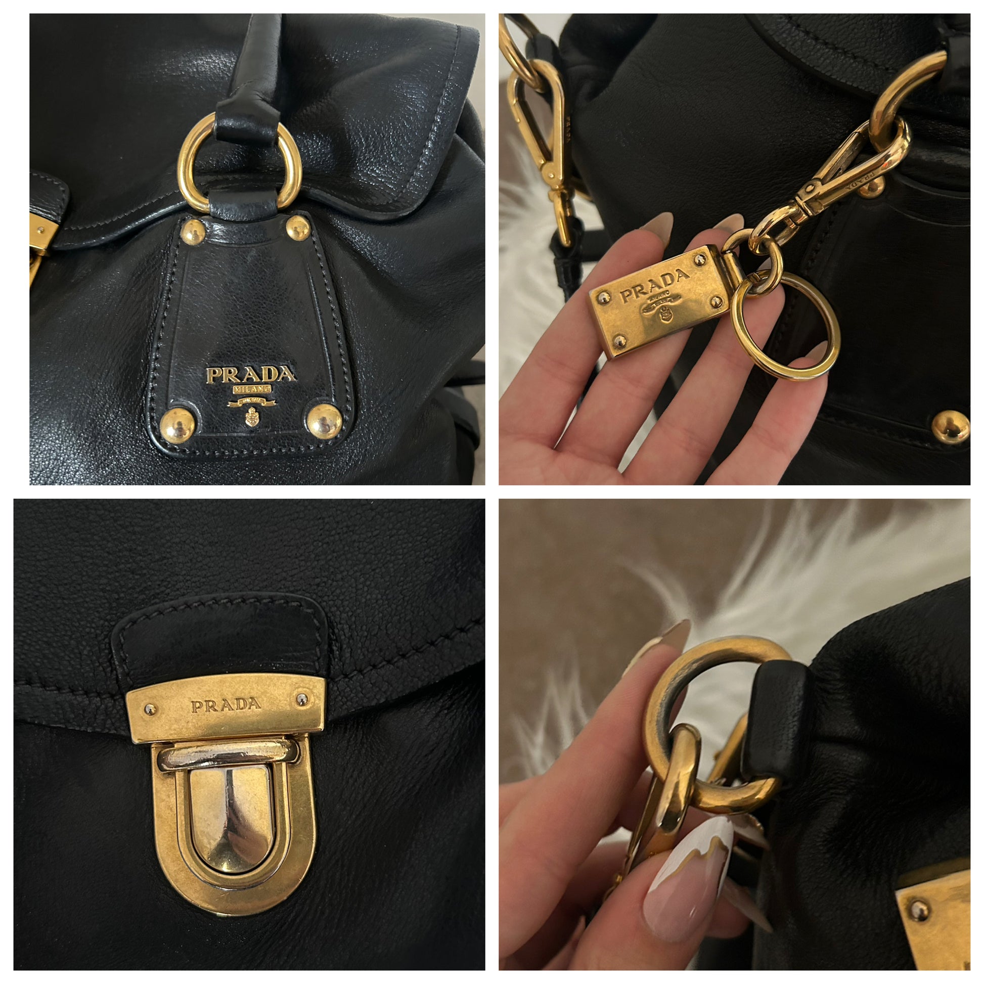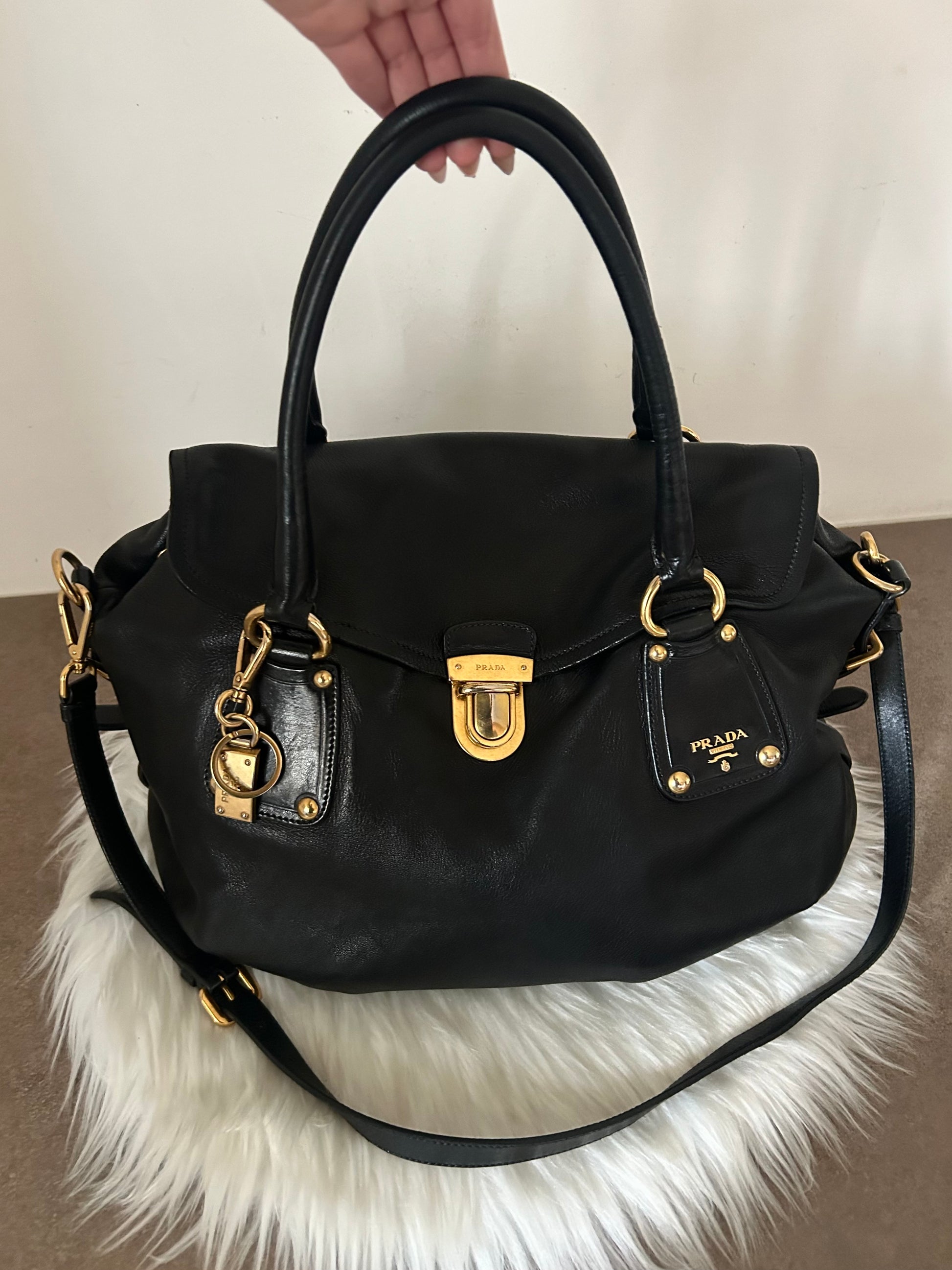 Prada tote in pelle nera morbidissima con tracolla. La borsa si presenta esattamente nelle condizioni mostrate in foto, si prega di guardarle attentamente poiché eventuali difetti o imperfezioni sono sempre mostrati. Il prezzo tiene sempre conto delle condizioni della borsa. Ogni articolo viene sempre igienizzato prima di essere spedito.