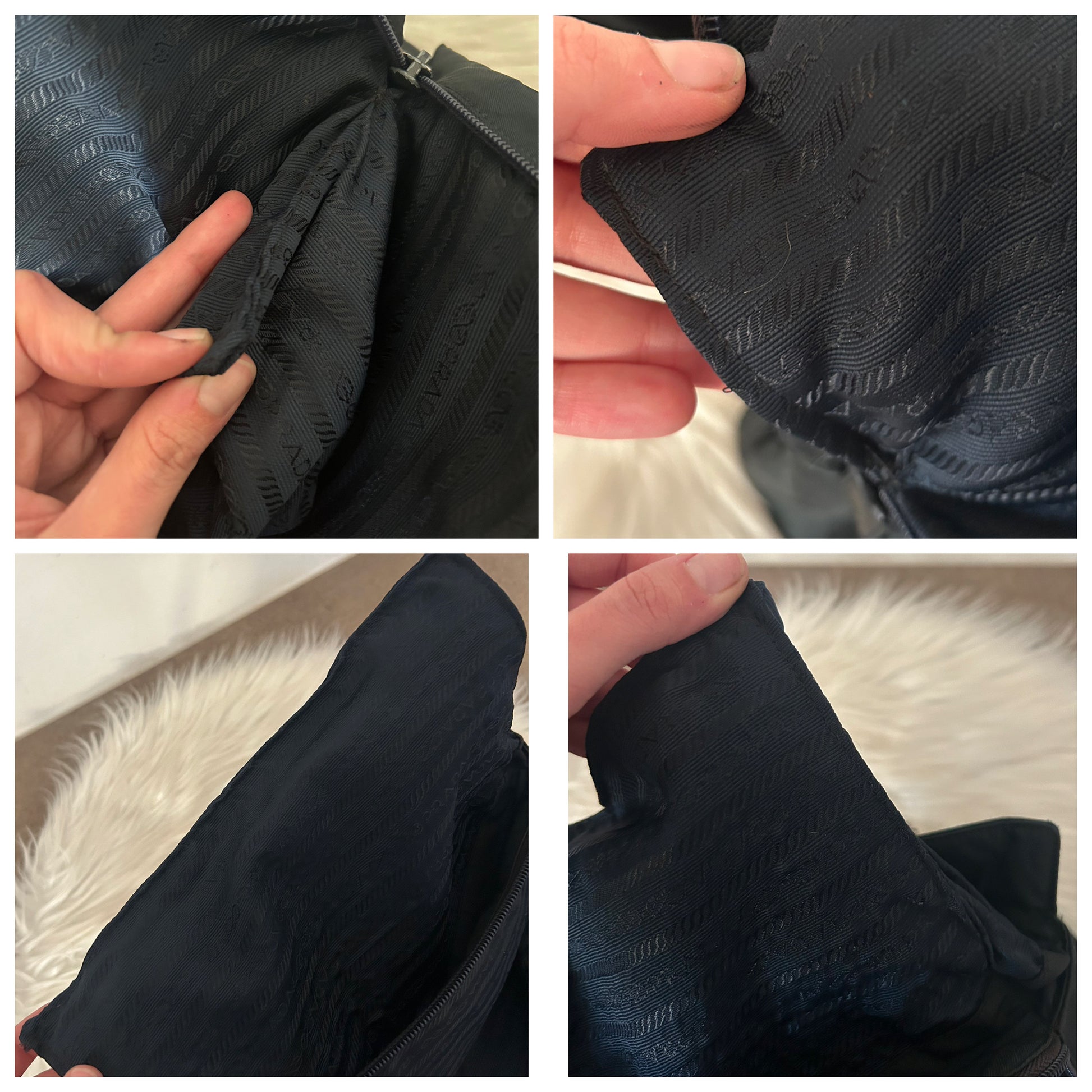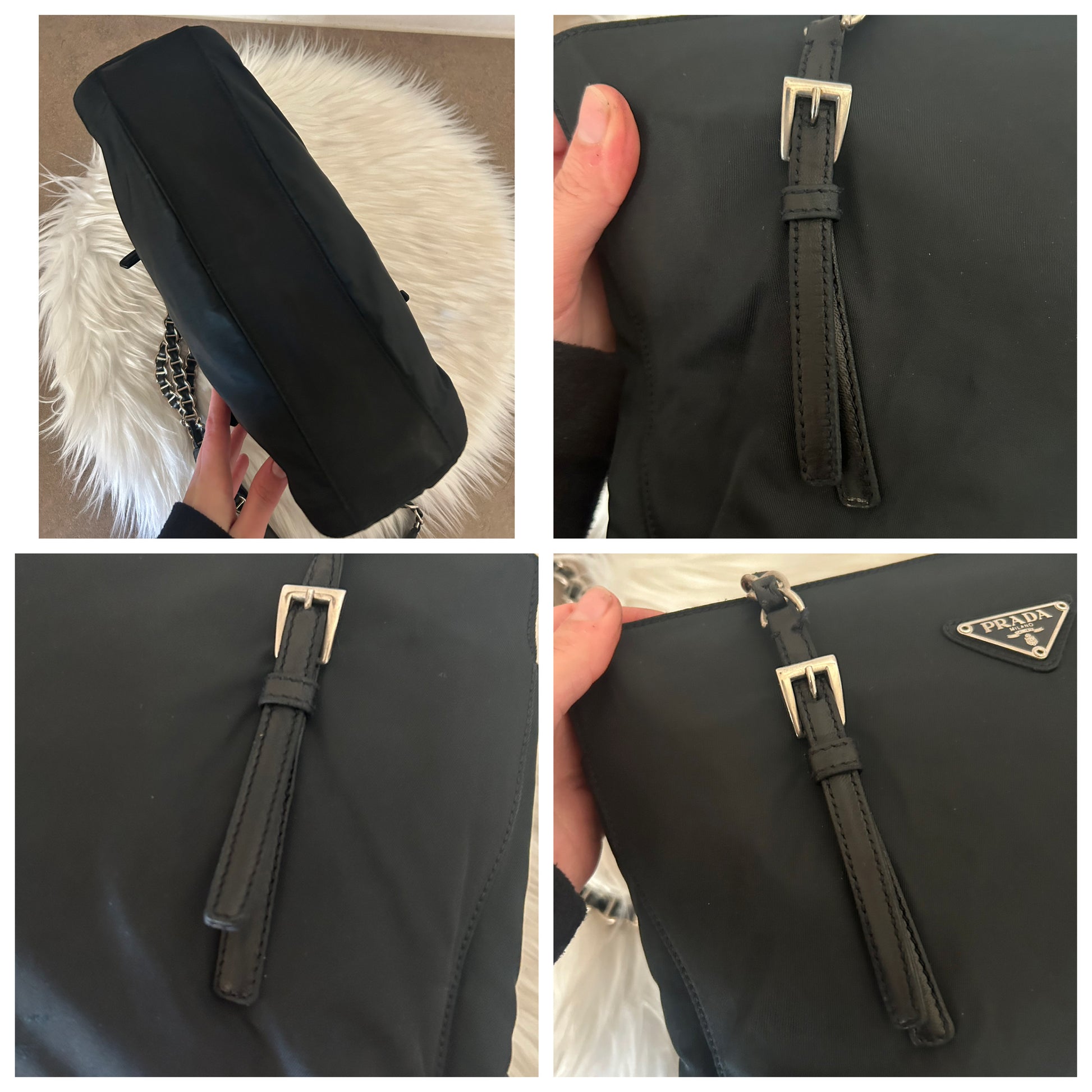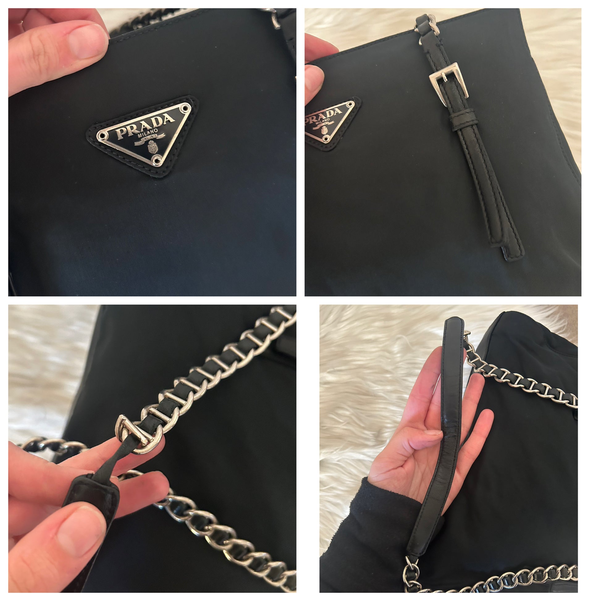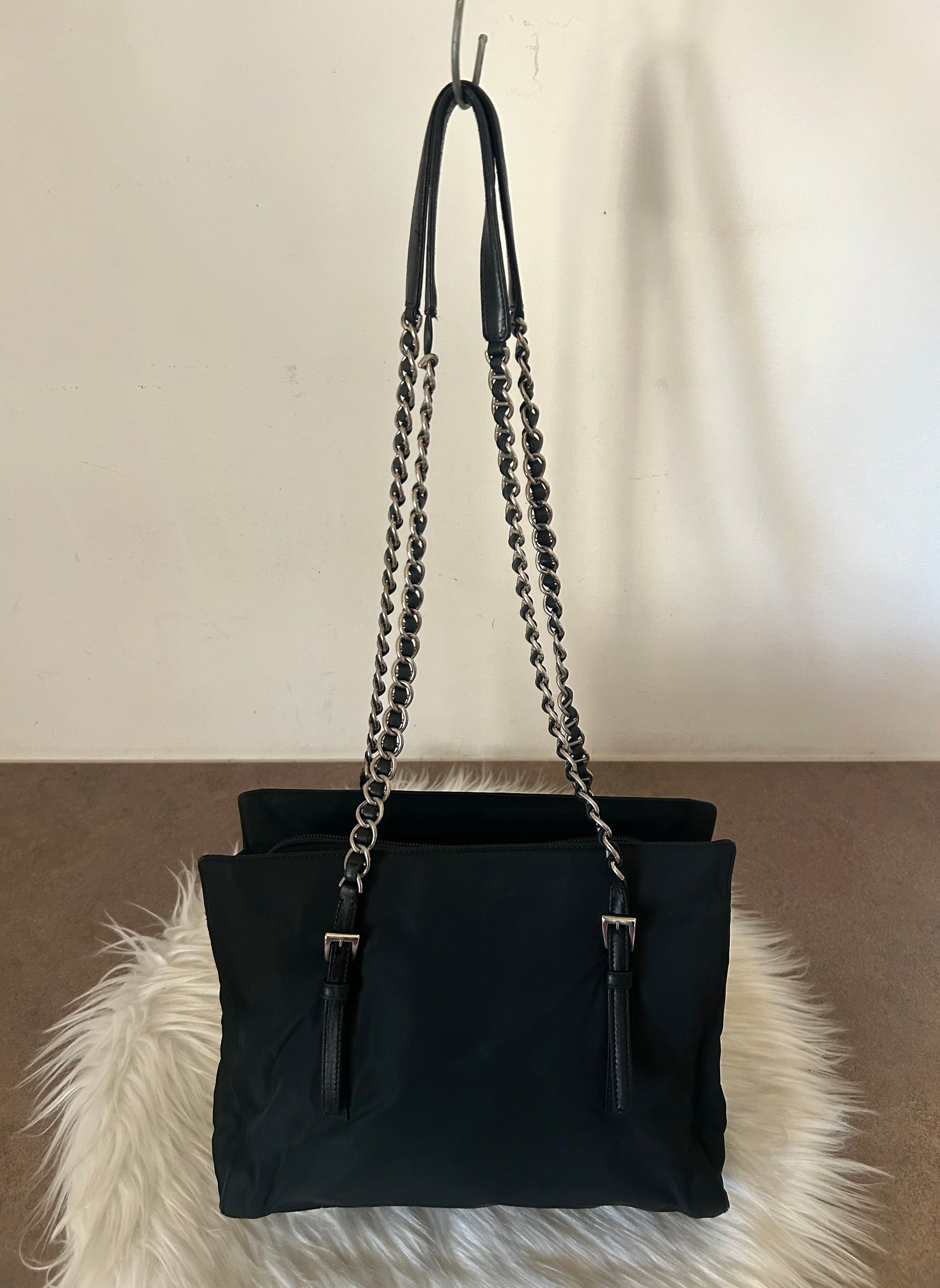 Prada tote in tela nera con catene vintage. Segnalo che il colore delle parti in pelle è stato fatto rinfrescare da un esperto del settore e che la tela è stata ricucita in alcuni punti. La borsa si presenta esattamente nelle condizioni mostrate in foto, si prega di guardarle attentamente poiché eventuali difetti o imperfezioni sono sempre mostrati. Il prezzo tiene sempre conto delle condizioni della borsa. Ogni articolo viene sempre igienizzato prima di essere spedito.