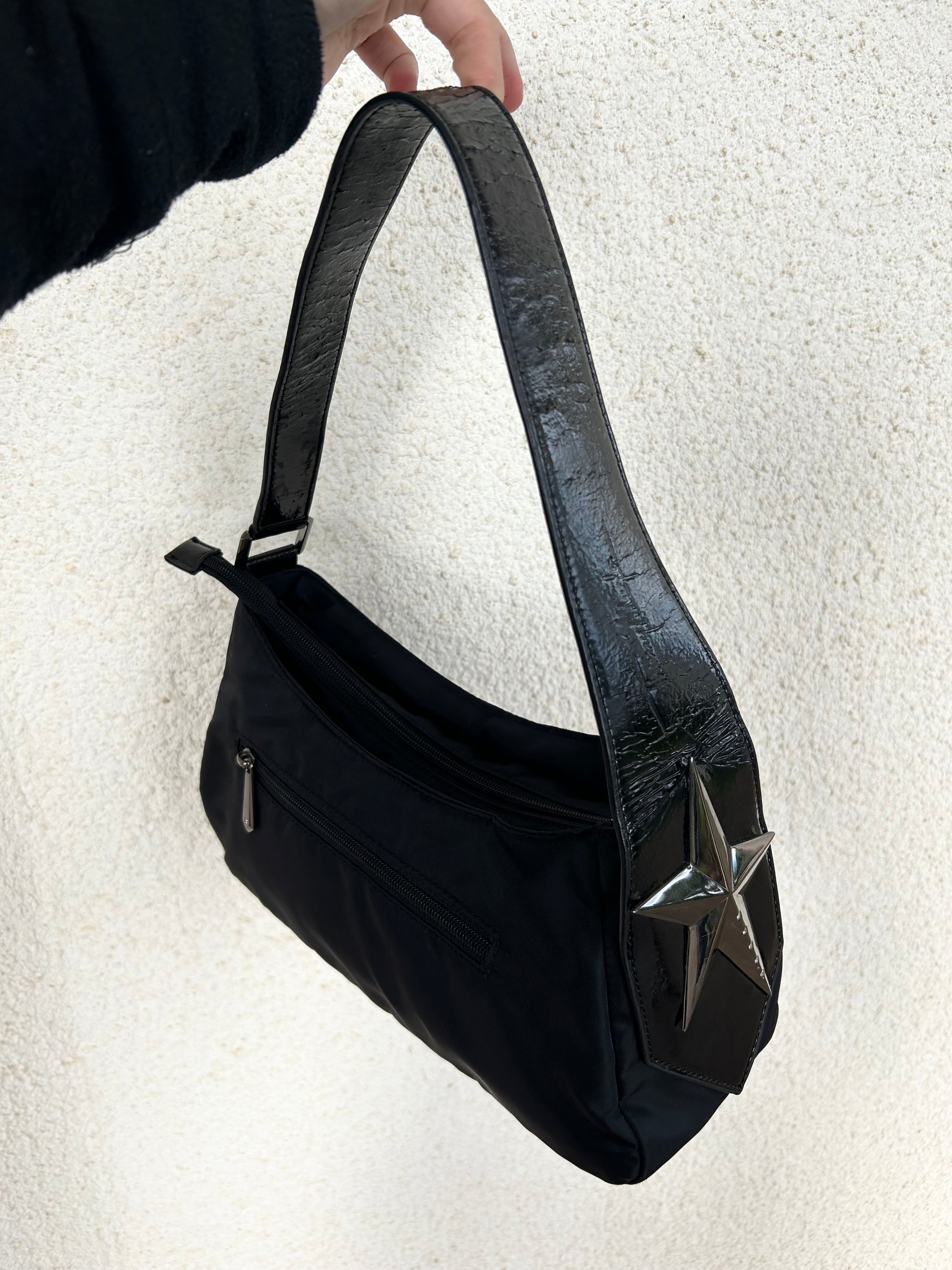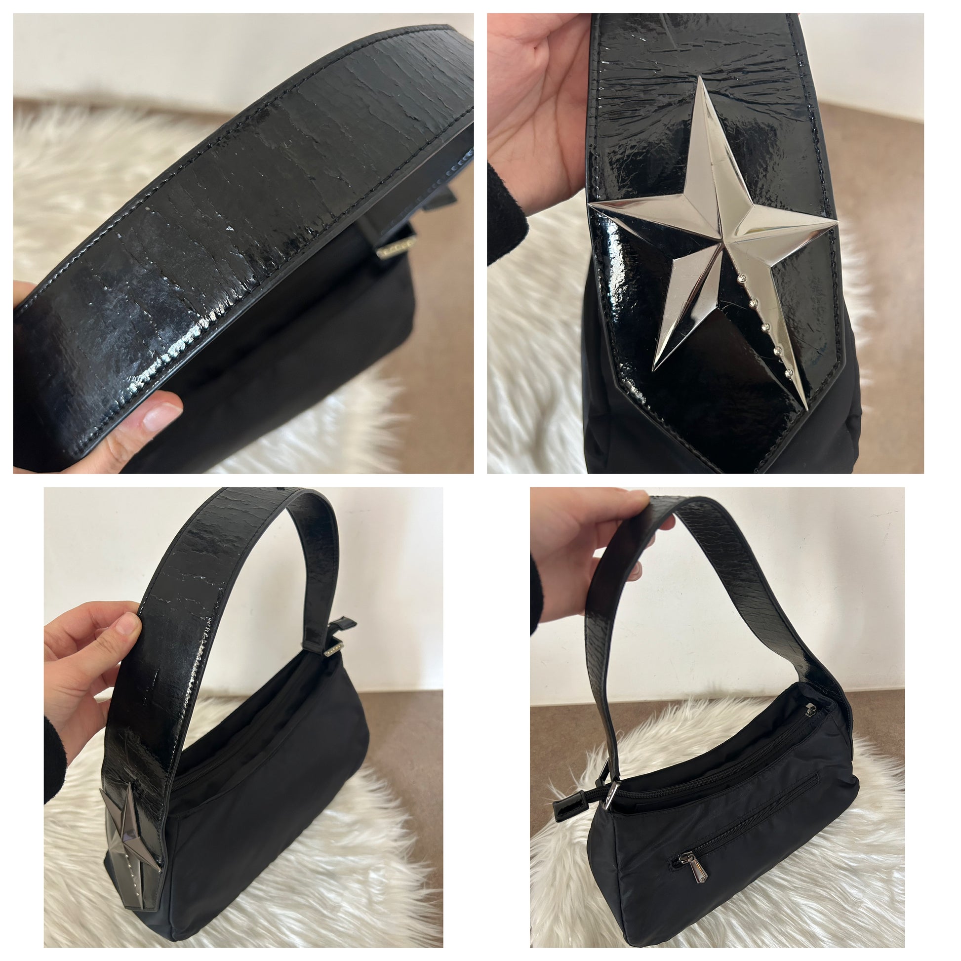 Thierry Mugler baguette a spalla in nylon nera vintage. Nelle foto in cui mostro la borsa indossata sembra di colore marrone ma in realtà ciò è causato solo dalla luce, la borsa è di colore nero. La borsa si presenta esattamente nelle condizioni mostrate in foto, si prega di guardarle attentamente poiché eventuali difetti o imperfezioni sono sempre mostrati. Il prezzo tiene sempre conto delle condizioni della borsa. Ogni articolo viene sempre igienizzato prima di essere spedito.