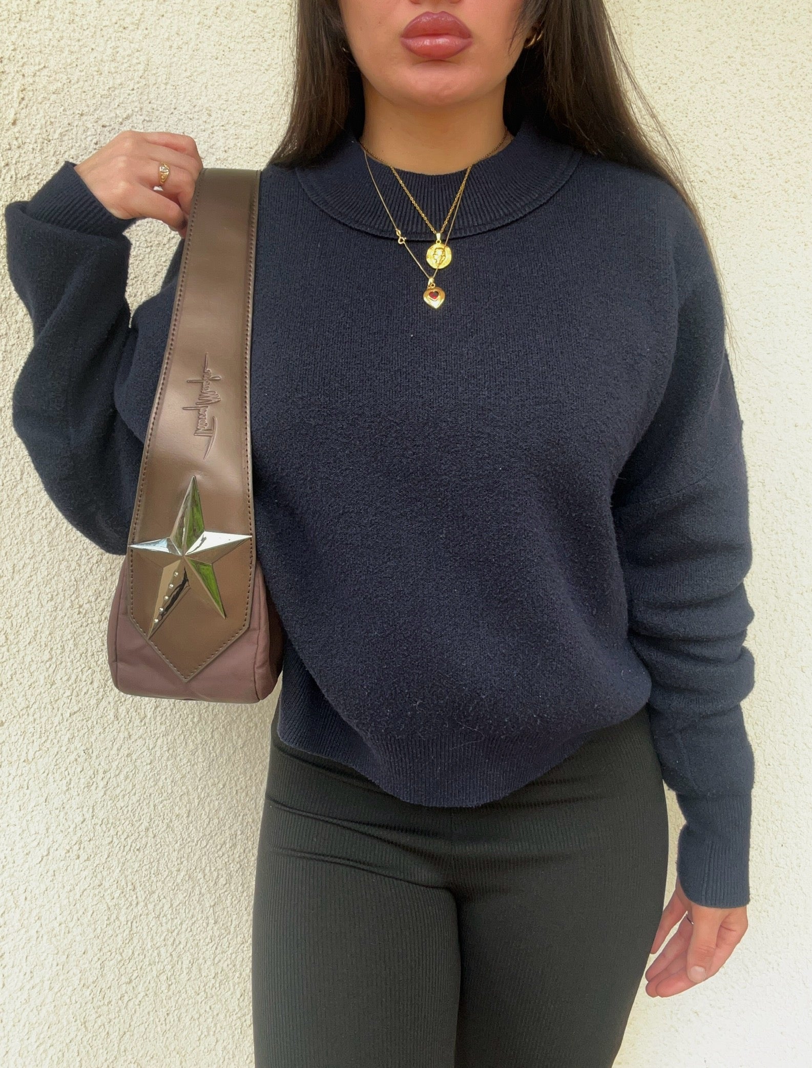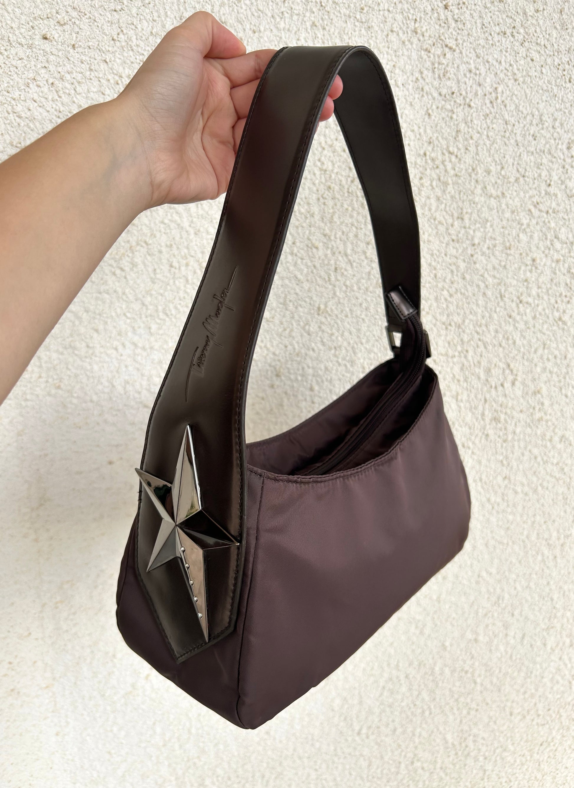 Baguette Thierry Mugler color cioccolato vintage. La borsa si presenta esattamente nelle condizioni mostrate in foto, si prega di guardarle attentamente poiché eventuali difetti o imperfezioni sono sempre mostrati. Il prezzo tiene sempre conto delle condizioni della borsa.