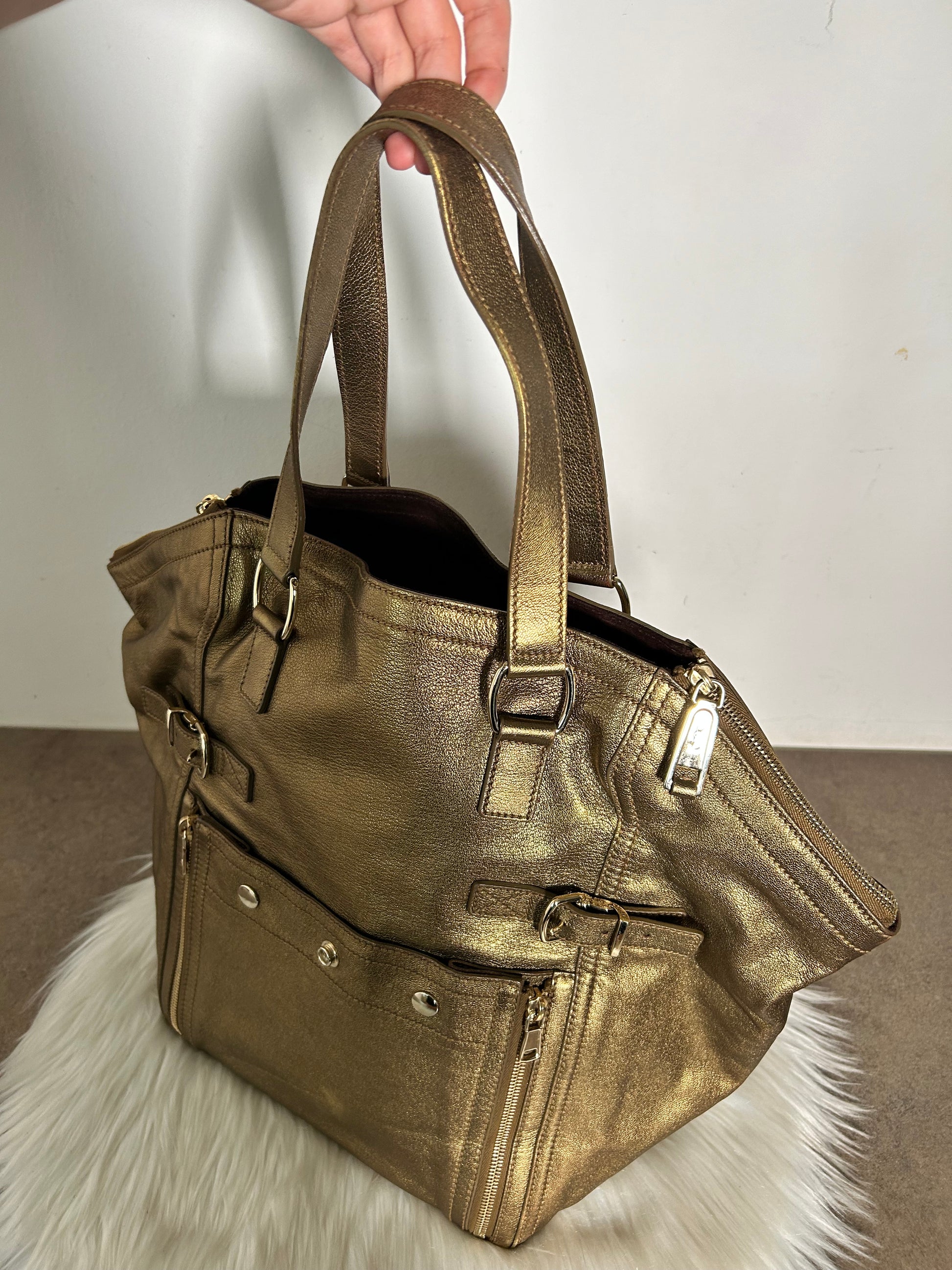 Borsa Yves Saint Laurent in pelle dorata e camoscio modello Downtown. La borsa si presenta esattamente nelle condizioni mostrate in foto, si prega di guardarle attentamente poiché eventuali difetti o imperfezioni sono sempre mostrati. Il prezzo tiene sempre conto delle condizioni della borsa.